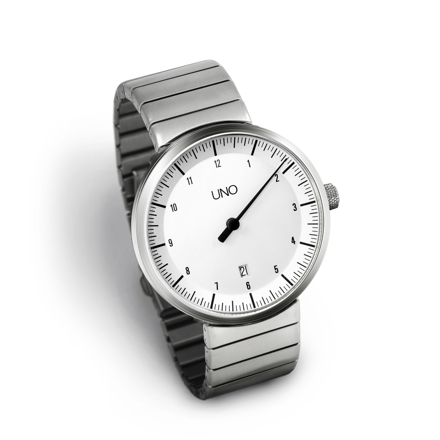 There's a popular saying which claims, “…things become clearer when you reduce them to their bare essentials.” This sentiment couldn’t ring more true when looking at the Uno Automatic collection, with their aesthetically ageless and classical approach to telling time. Simply one hand on the dial spares you from complication, while still completing 12 hour rotation just like any other conventional timepiece. The contrast of a bold, white dial and a sleek, steel link strap makes a statement that radiates quality and sophistication. Even better is the dial with its angled scale ring--it helps prevent the so-called "parallax effect" due to the fact that the precise scale is positioned very closely to the specially developed hand, making it all the more decipherable.