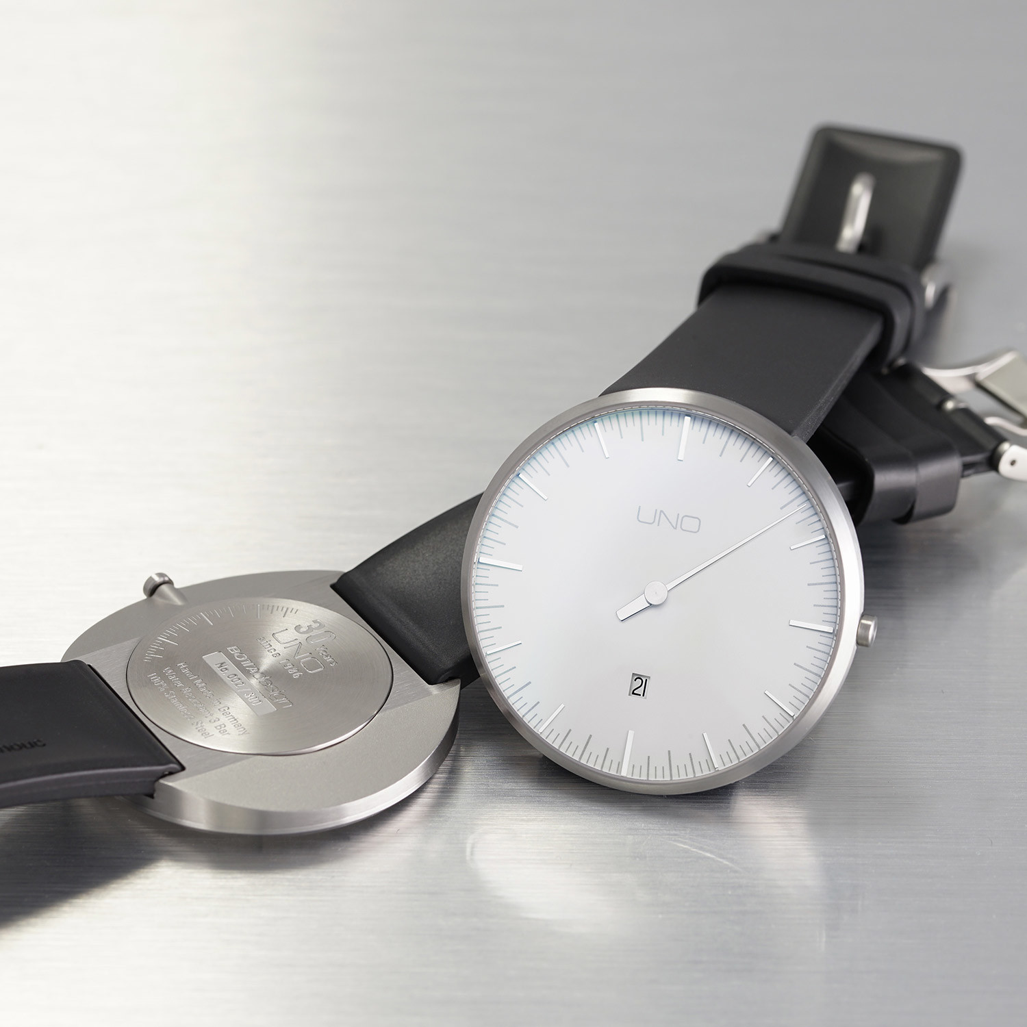 Intricately constructed in Germany, the Botta Design UNO+ Quartz is characterized by a concentration on the bare essentials. The salient design features of every Botta Design wristwatch are functional clarity and a high degree of technical aesthetic which is underlined by the precision of the workmanship.