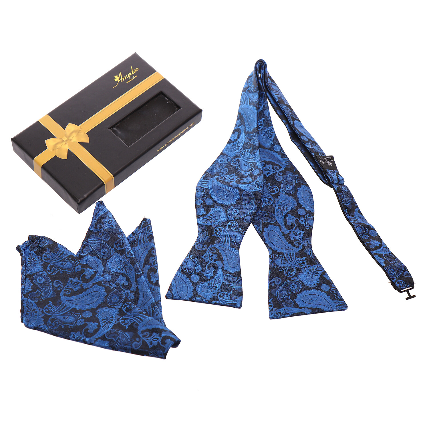 Make a fashion statement with an Amedeo Exclusive self-tie bow tie and hanky set. Each set is bold, but with a classic flair that offers an instant boost to dressier looks. Perfect for work or for your net big event, these timeless wardrobe accessories will never fail to impress.