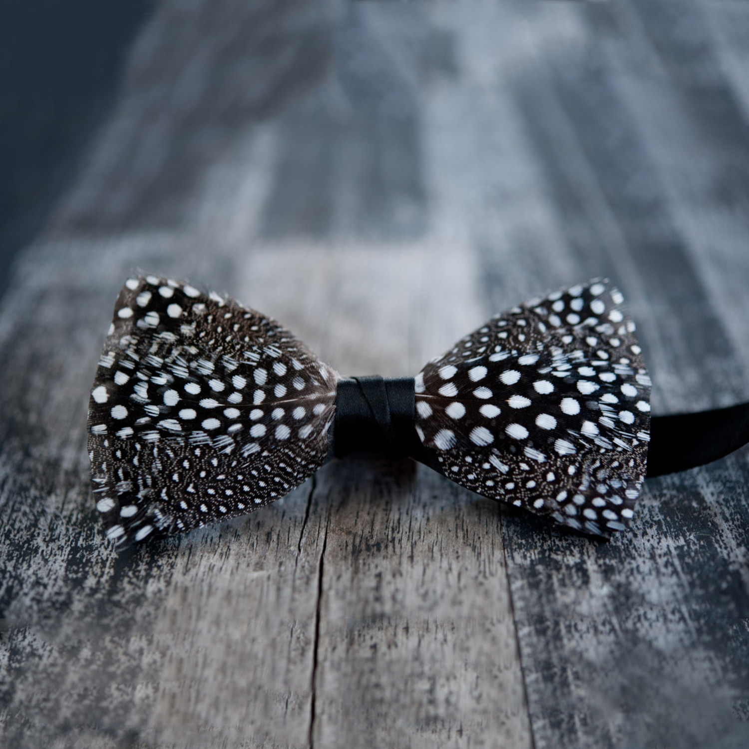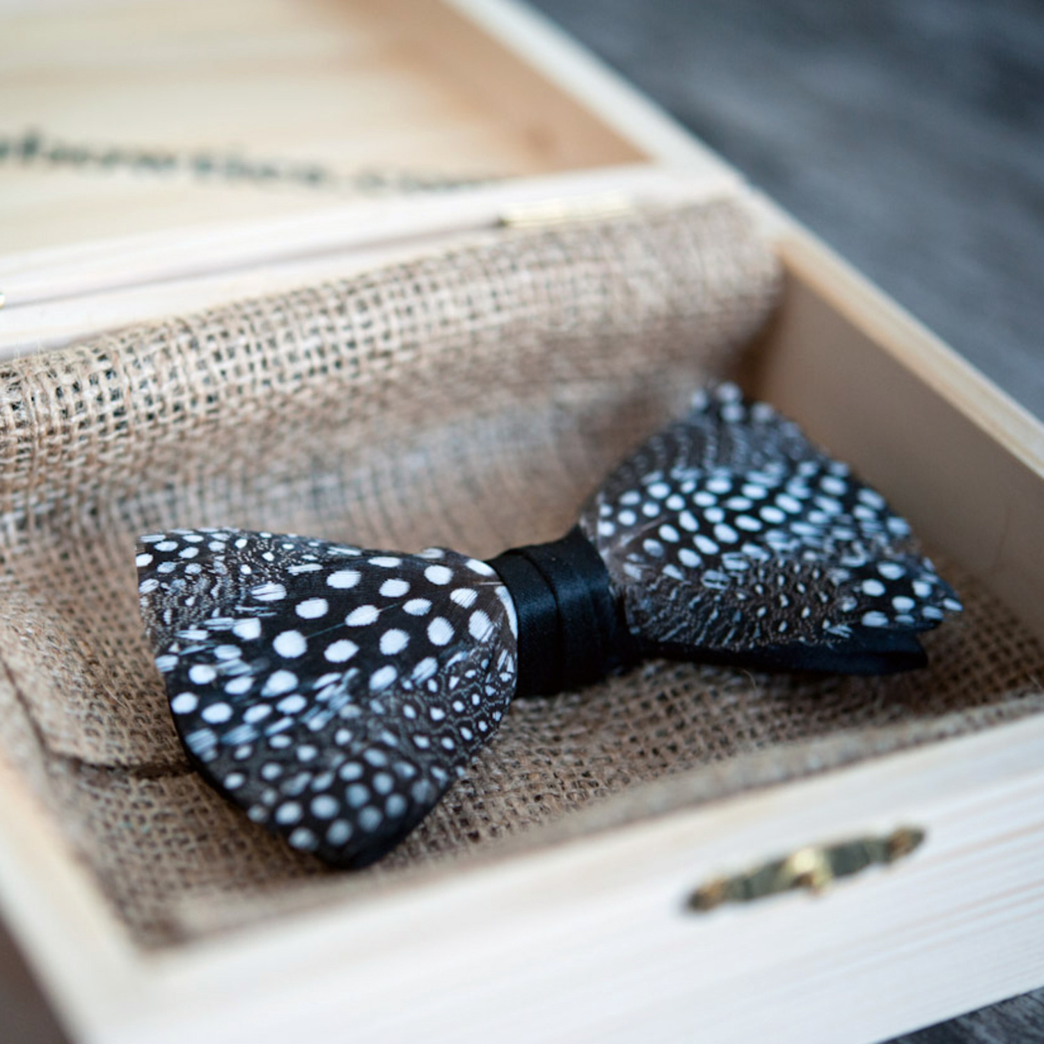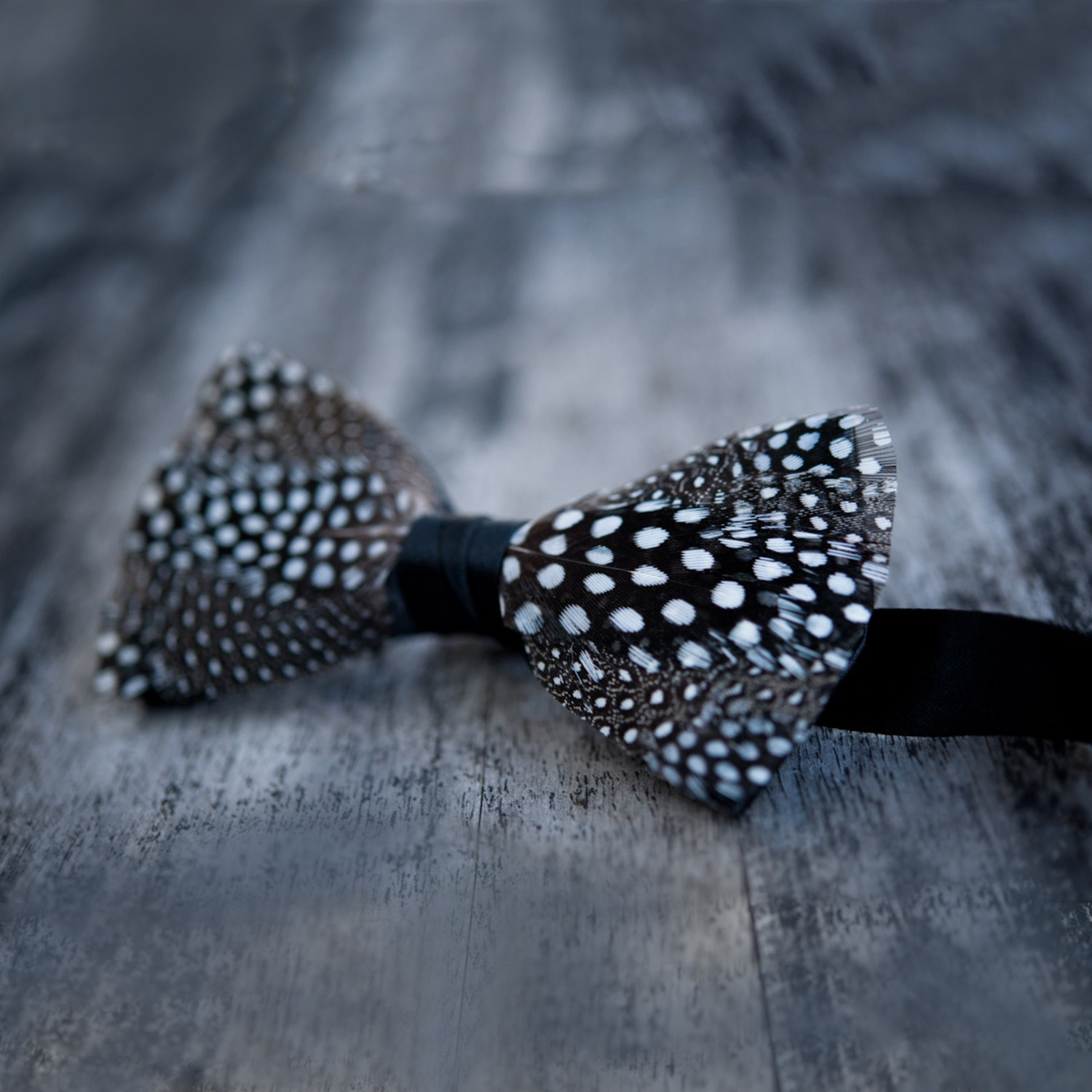 For an occasion that calls for a red carpet-worthy look, go for this Brackish Ties formal showstopper. Each Guinea Bowtie is meticulously handmade from black and white patterned guinea fowl feathers that are placed, layer by layer, to highlight the natural contrasts in the plumage. Dapper and unique, this head-turning accessory is decisively unconventional.
