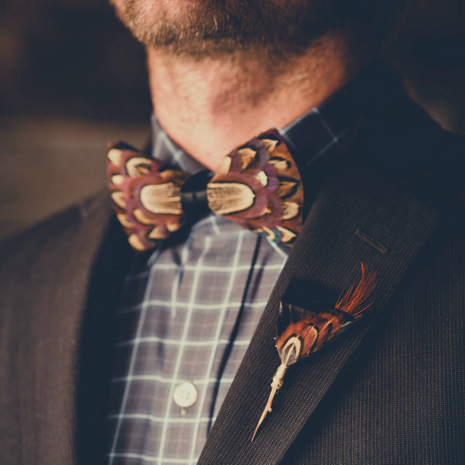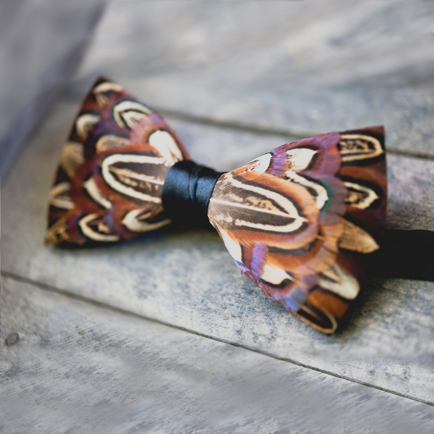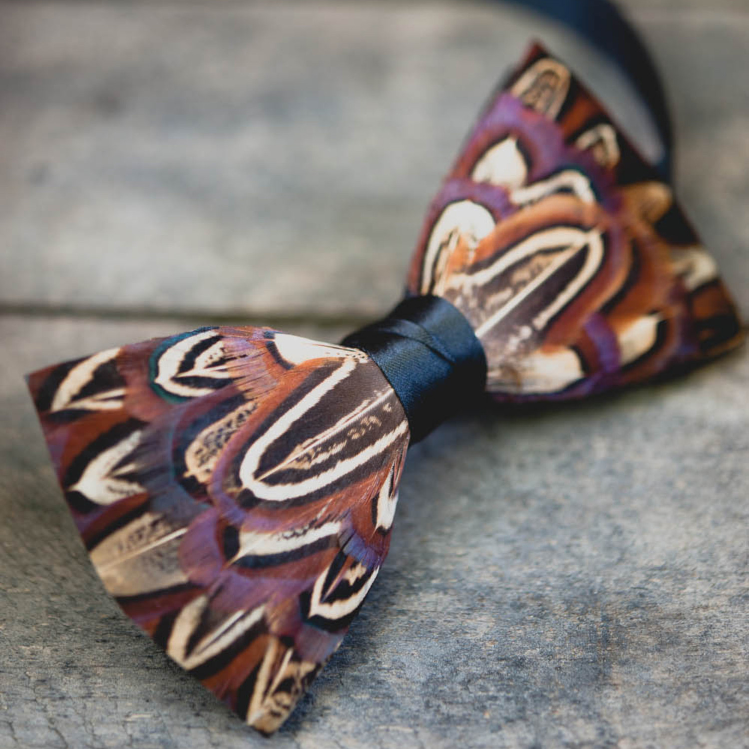 Besides looking good at your next social gathering (you always do), wouldn't you like something to talk about besides the spinach dip and your desk job? Look no further than the ultimate conversation starter, the Phunky Pheasant. Layered with authentic pheasant feathers, this handcrafted bow tie is the real deal—dangerously dapper with rustic appeal. This bow tie has varying shades of black, almond, and brick red with hints of umber.