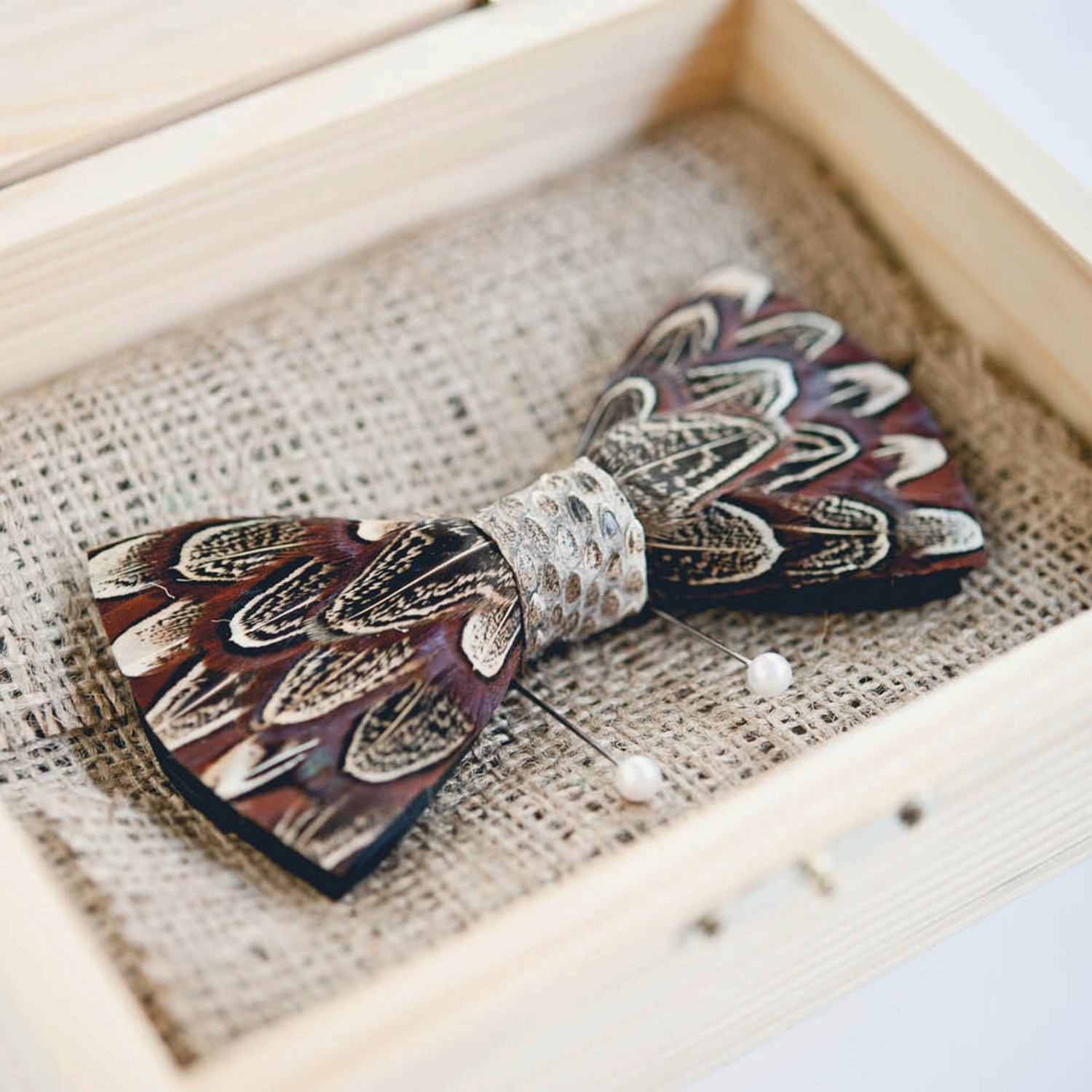 Besides looking good at your next social gathering (you always do), wouldn't you like something to talk about besides the spinach dip and your desk job? Look no further than the ultimate conversation starter, the Phunky Pheasant. Layered with authentic pheasant feathers, this handcrafted bow tie is the real deal — dangerously dapper with rustic appeal. Snakeskin has been handstitched into the tie for a wild look that takes the design to another level.