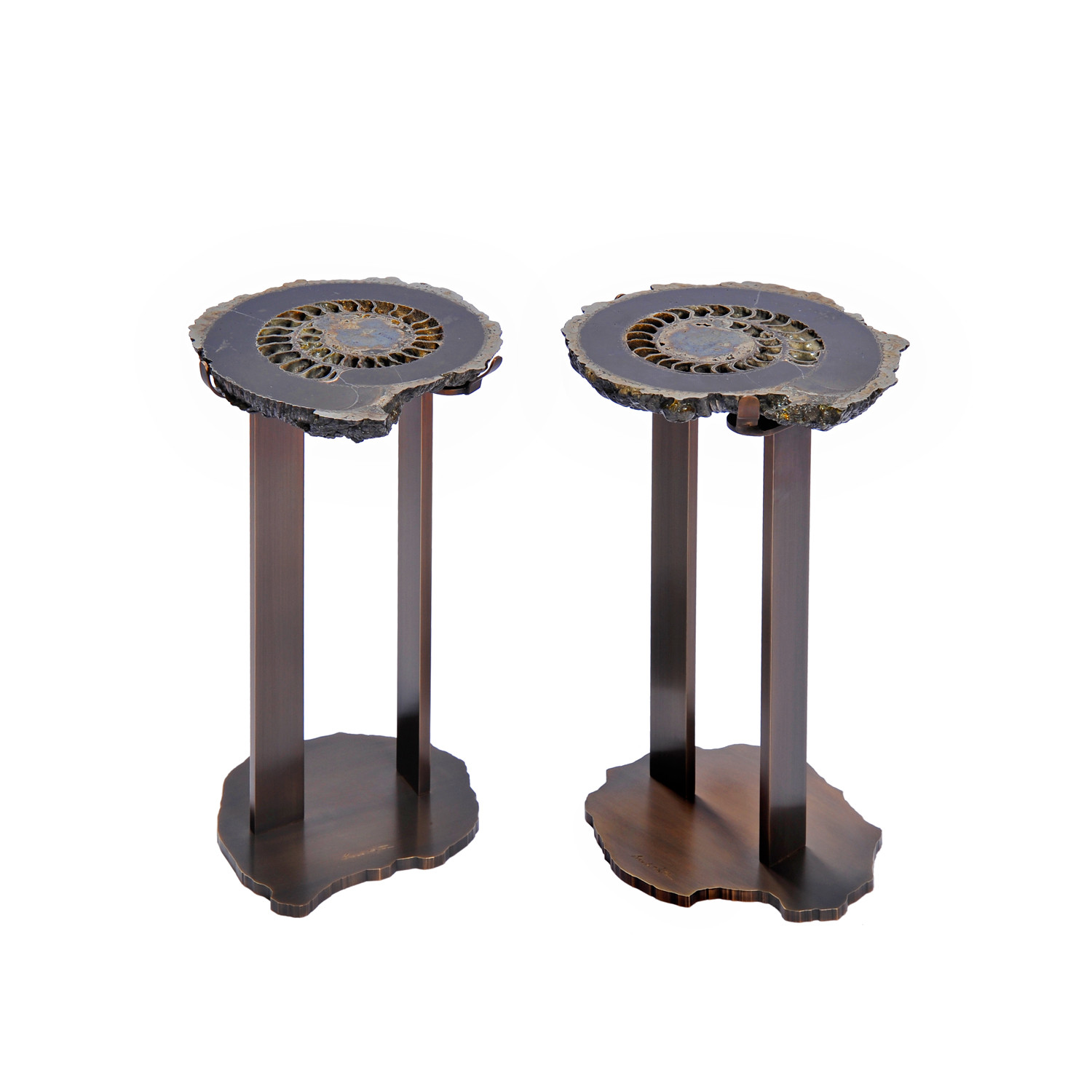 The Accento Ruso Ammonita features an incredible matching pair of Russian ammonite fossils from the Jurassic era. Russian ammonites are extremely rare and covered in pyrite, producing a metallic finish. Ammonites roamed the Earth 165 million years ago. Today’s squid is the descendant of the ammonite, but cannot compare to this mysterious creature's craftsmanship.