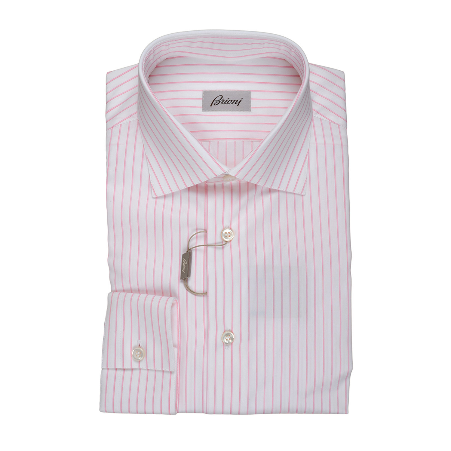 With its svelte tailoring and crisp appeal, this uncomplicated Brioni dress shirt exudes a classic style that transcends time and trend. Boasting contrast buttons, adjustable cuffs, and a spread collar, it's the clear-cut choice for office-wear and dressy occasions alike.
