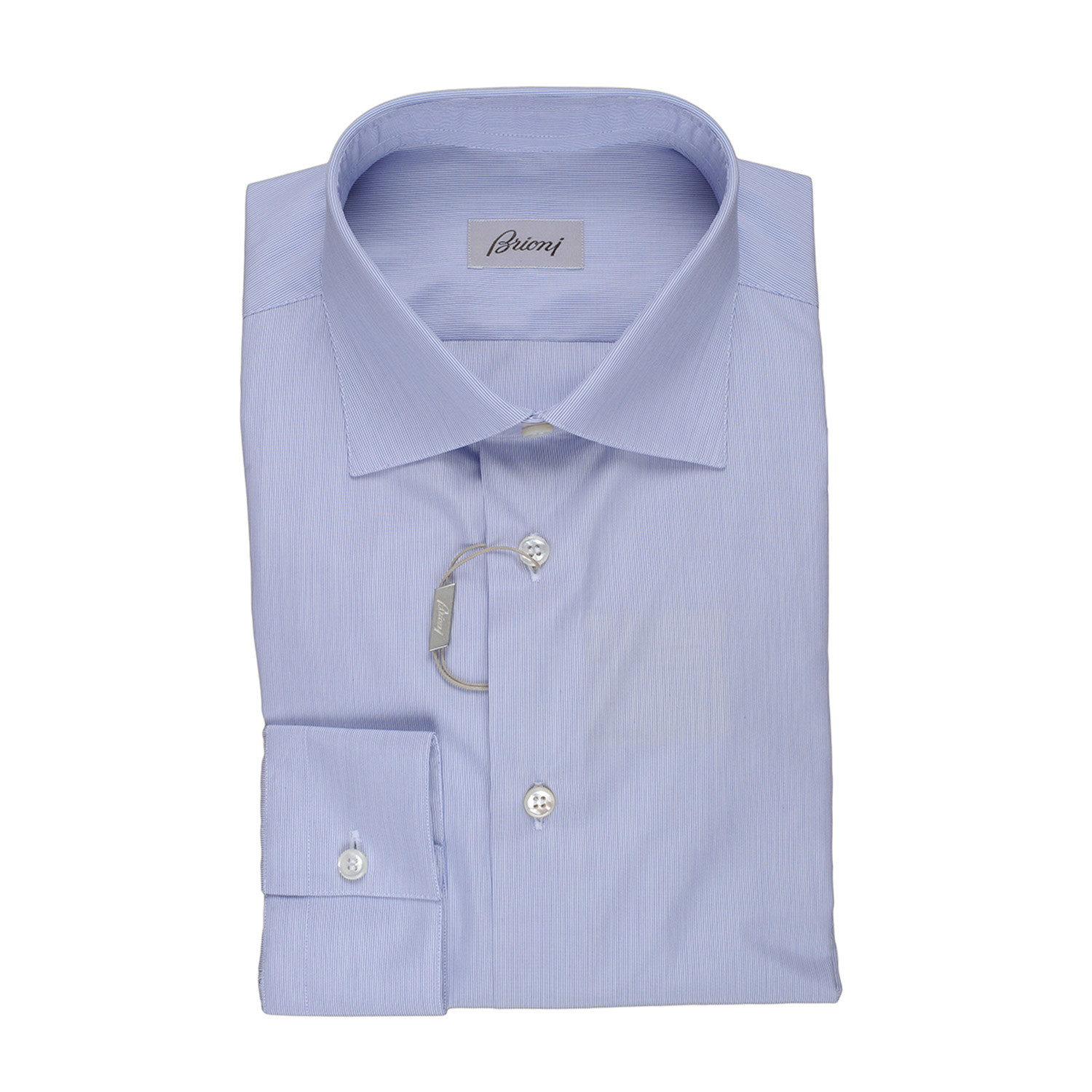 With its svelte tailoring and crisp appeal, this uncomplicated Brioni dress shirt exudes a classic style that transcends time and trend. Boasting contrast buttons, adjustable cuffs, and a spread collar, it's the clear-cut choice for office-wear and dressy occasions alike.
