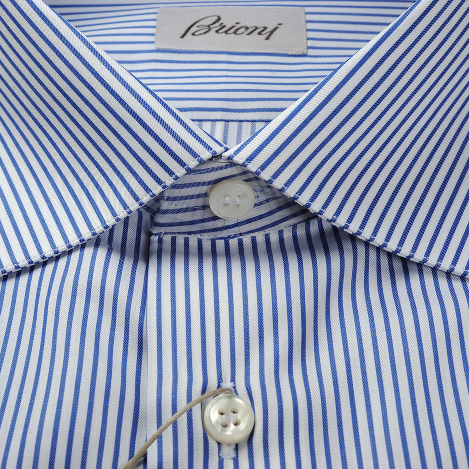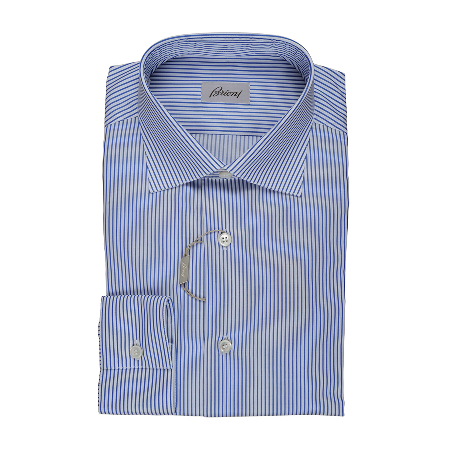 With its svelte tailoring and crisp appeal, this uncomplicated Brioni dress shirt exudes a classic style that transcends time and trend. Boasting contrast buttons, adjustable cuffs, and a spread collar, it's the clear-cut choice for office-wear and dressy occasions alike.
