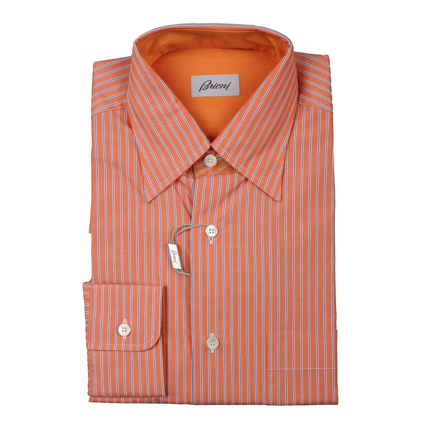 With its svelte tailoring and crisp appeal, this uncomplicated Brioni dress shirt exudes a classic style that transcends time and trend. Boasting contrast buttons, adjustable cuffs, and a spread collar, it's the clear-cut choice for office-wear and dressy occasions alike.