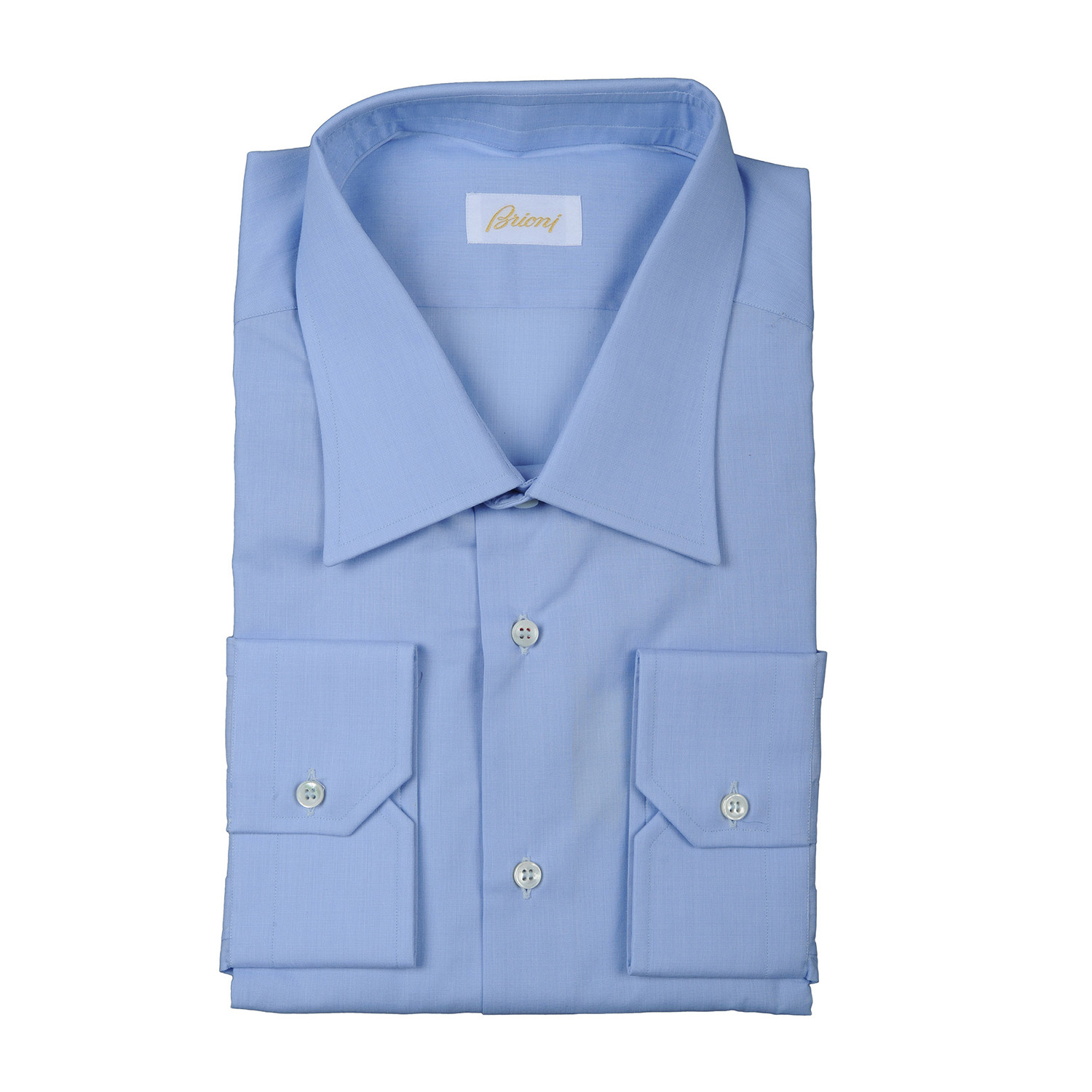 With its svelte tailoring and crisp appeal, this uncomplicated Brioni dress shirt exudes a classic style that transcends time and trend. Boasting contrast buttons, adjustable cuffs, and a spread collar, it's the clear-cut choice for office-wear and dressy occasions alike.