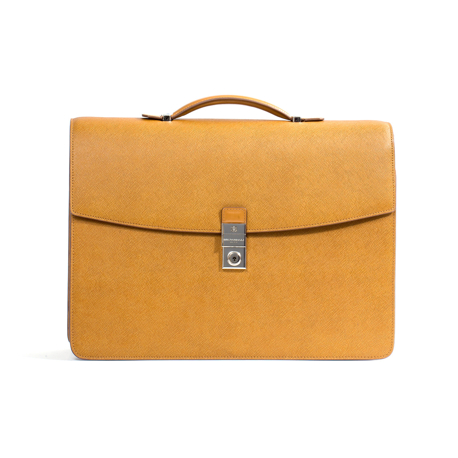 This Bruno Magli document case is a sleek piece to add to your collection. It has the ability to fit everything from a tablet to work files with its spacious pockets and pouches. It is offered in a variety of colors with brass hardware to complete the look.