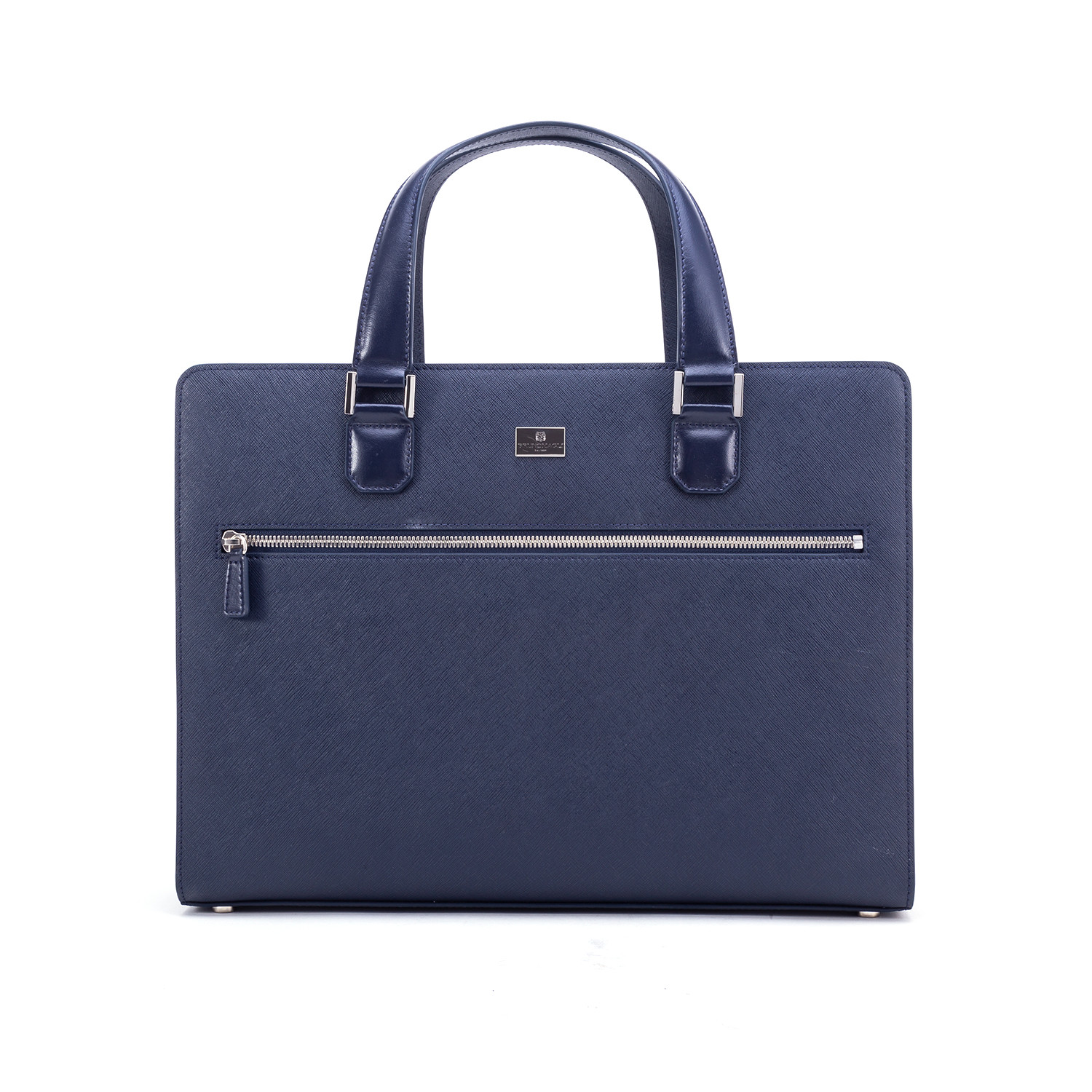 This stylish briefcase from Bruno Magli comes in five distinguished colors that will stand out on any occasion. It is made of micro-textured Saffiano leather with a signature bordeaux lining. Its functionality includes multiple pockets for storage and leather handles for easy travel.