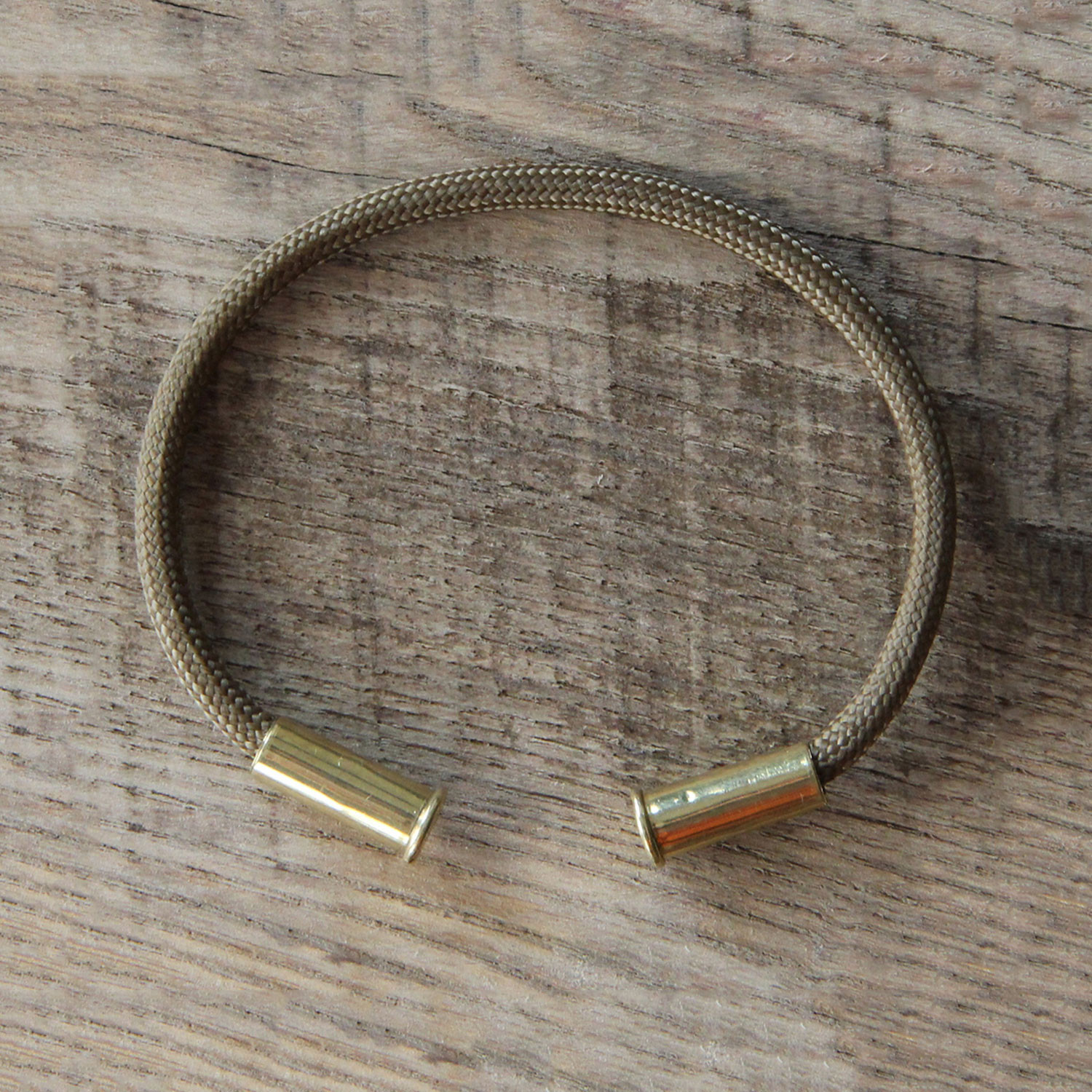 This Recycled Bullet Casing Bracelet has been handmade in Chicago using Made in the USA materials and hand tools. It's been individually crafted from brown 550 paracord, real .22lr bullet casings that have been fired and tumbled, and heavy gauge wire.