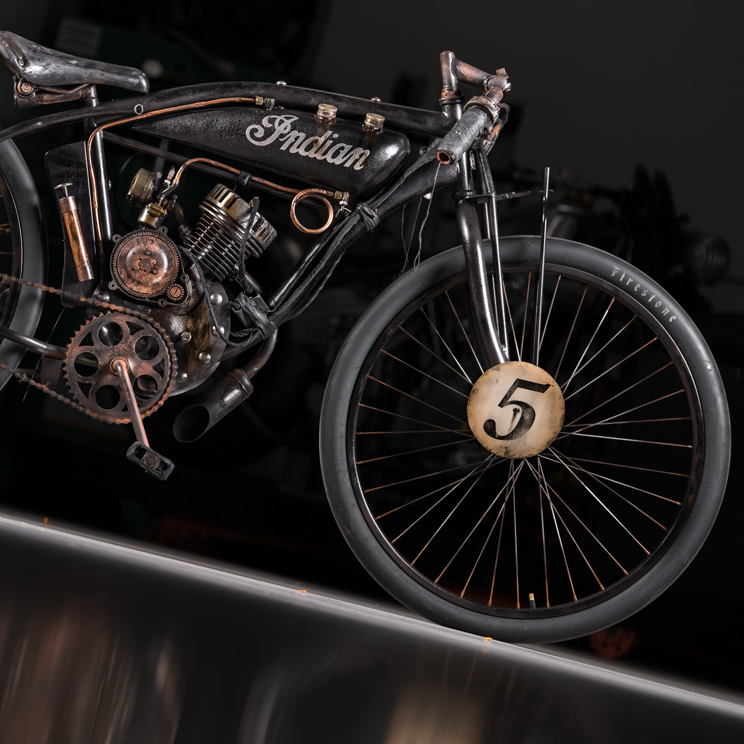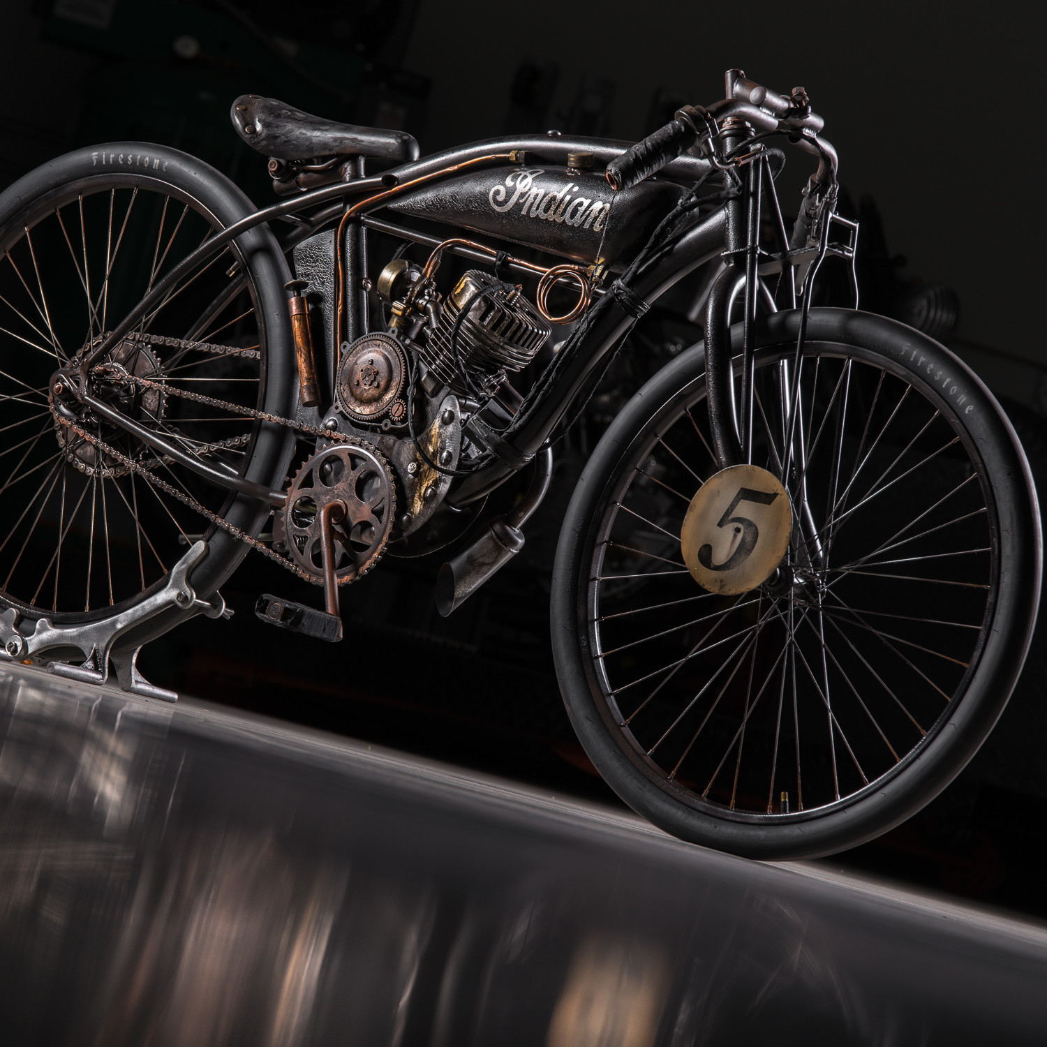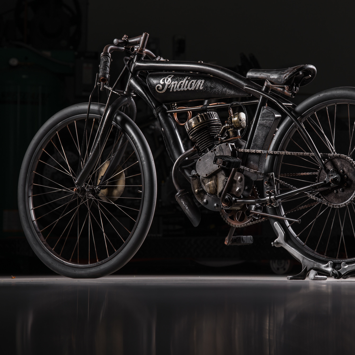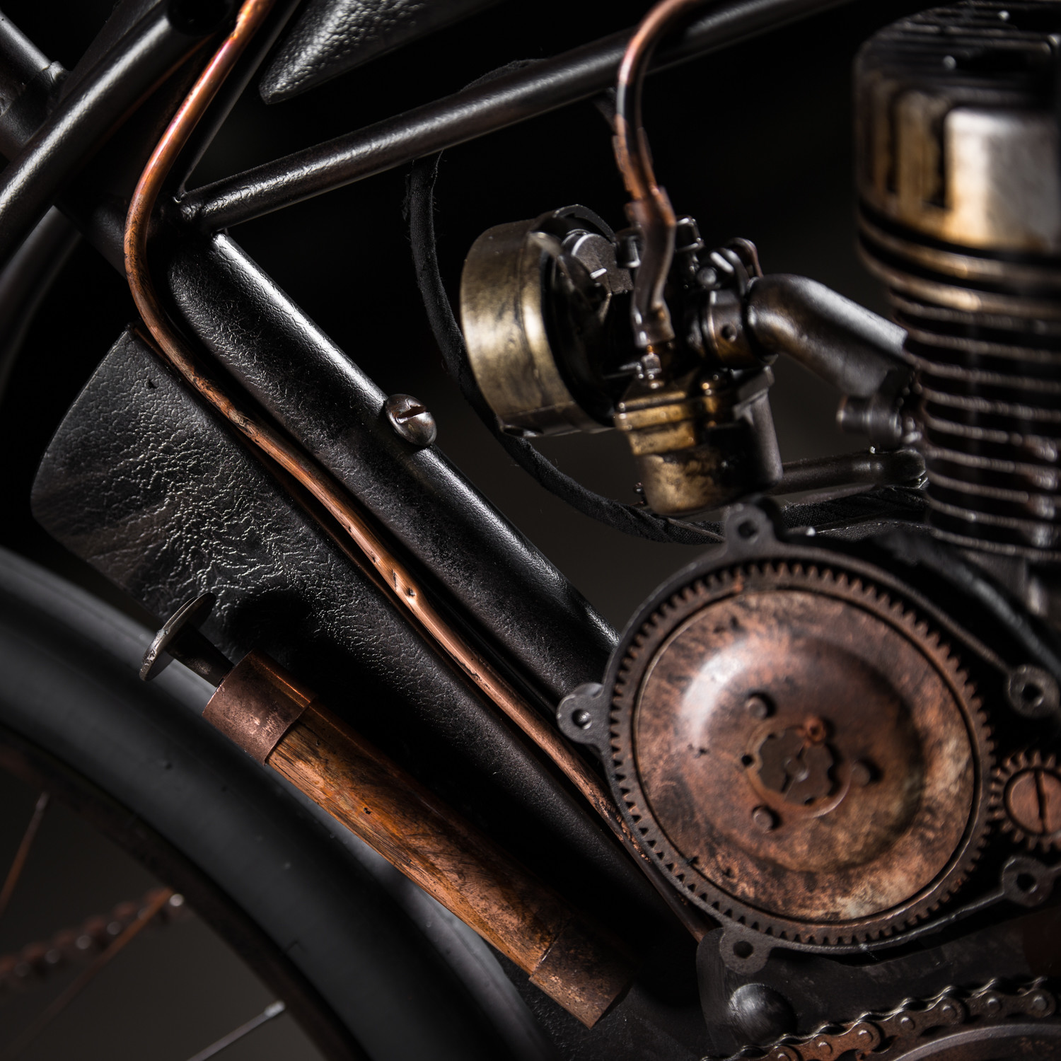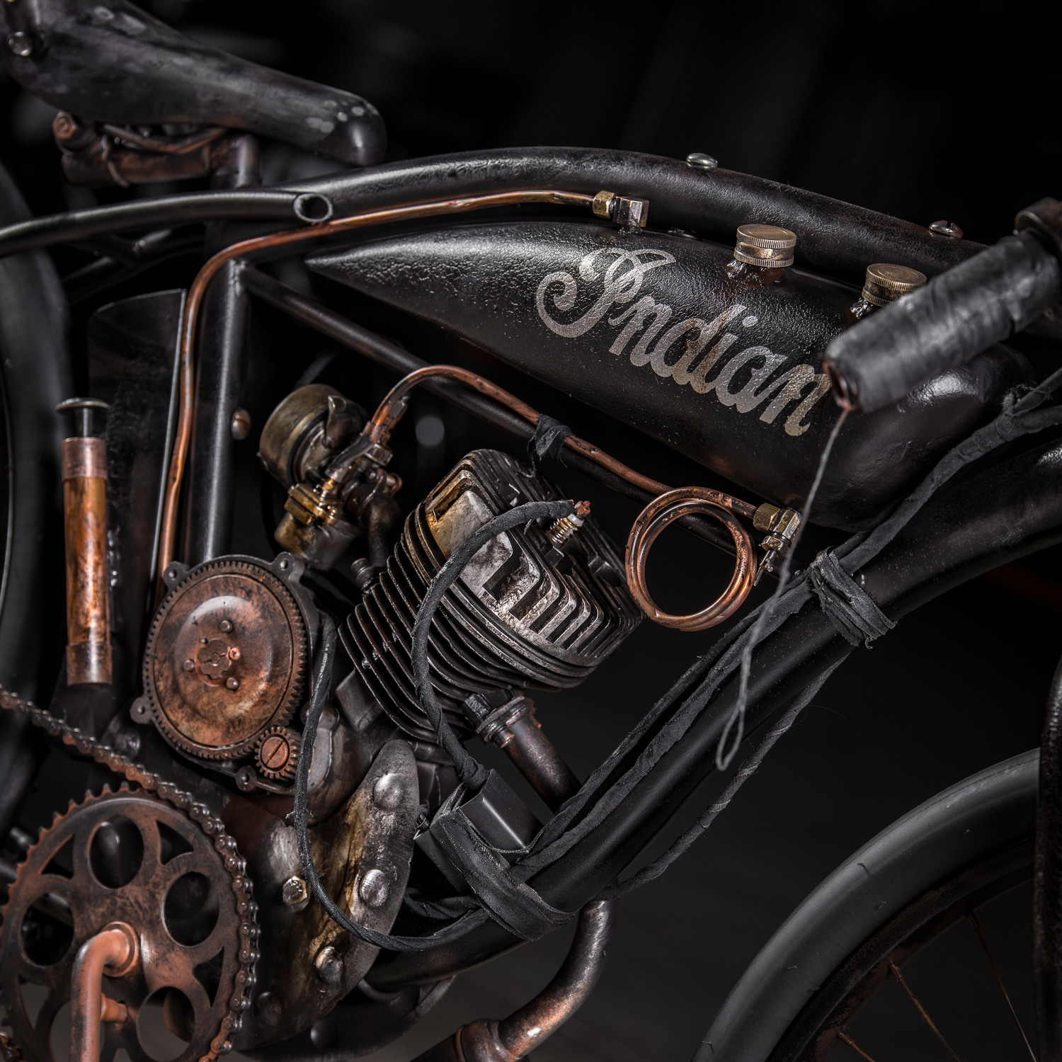 Created to pay homage to the early board track racing days of the past, the Bull Cycles Indian Board Track Racer tribute bike is a fully functional tribute to the 1920 Indian Daytona. The color is a beautiful black with hand cracked under-base and countless hours of detailed airbrush finishing to achieve the look of a well-aged motorbike. The finish is sealed, and there is no actual oil or grease used. The custom tig welded fuel tanks are made from ¼” aluminum and will not dent, rust, or leak. These bikes are fully functional and are powered by a 66cc two stroke motor. They can travel up to 30 MPH at roughly 80 MPG. Operating the bikes is simple, with an easy pedal start and twist throttle.
