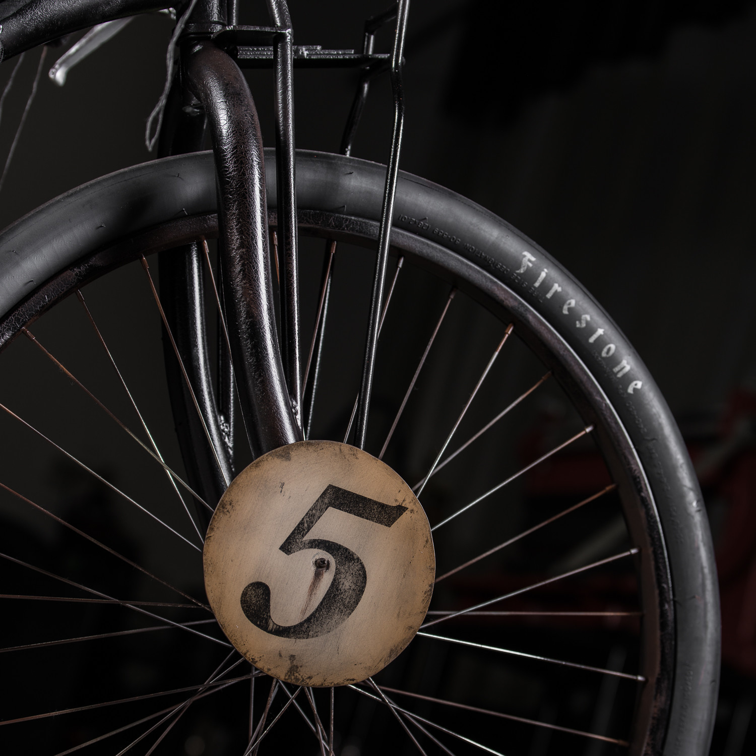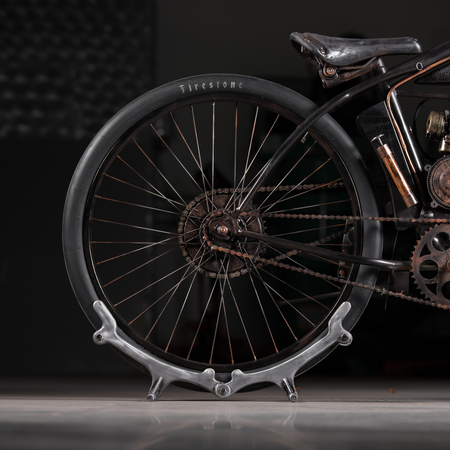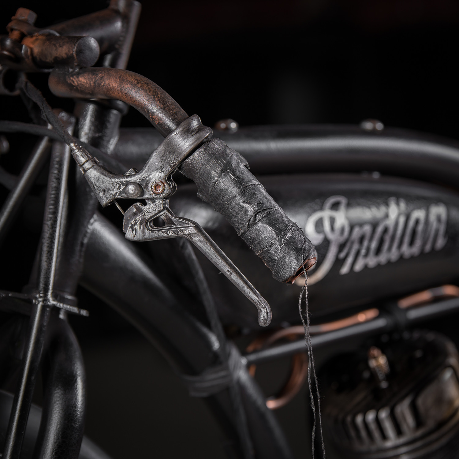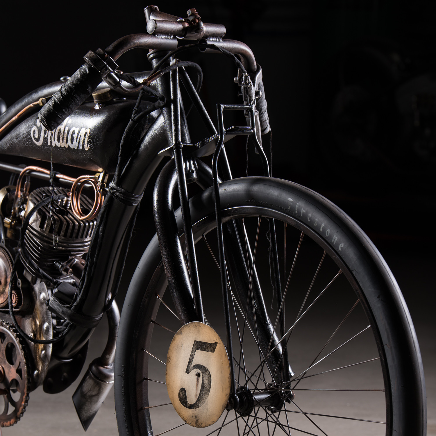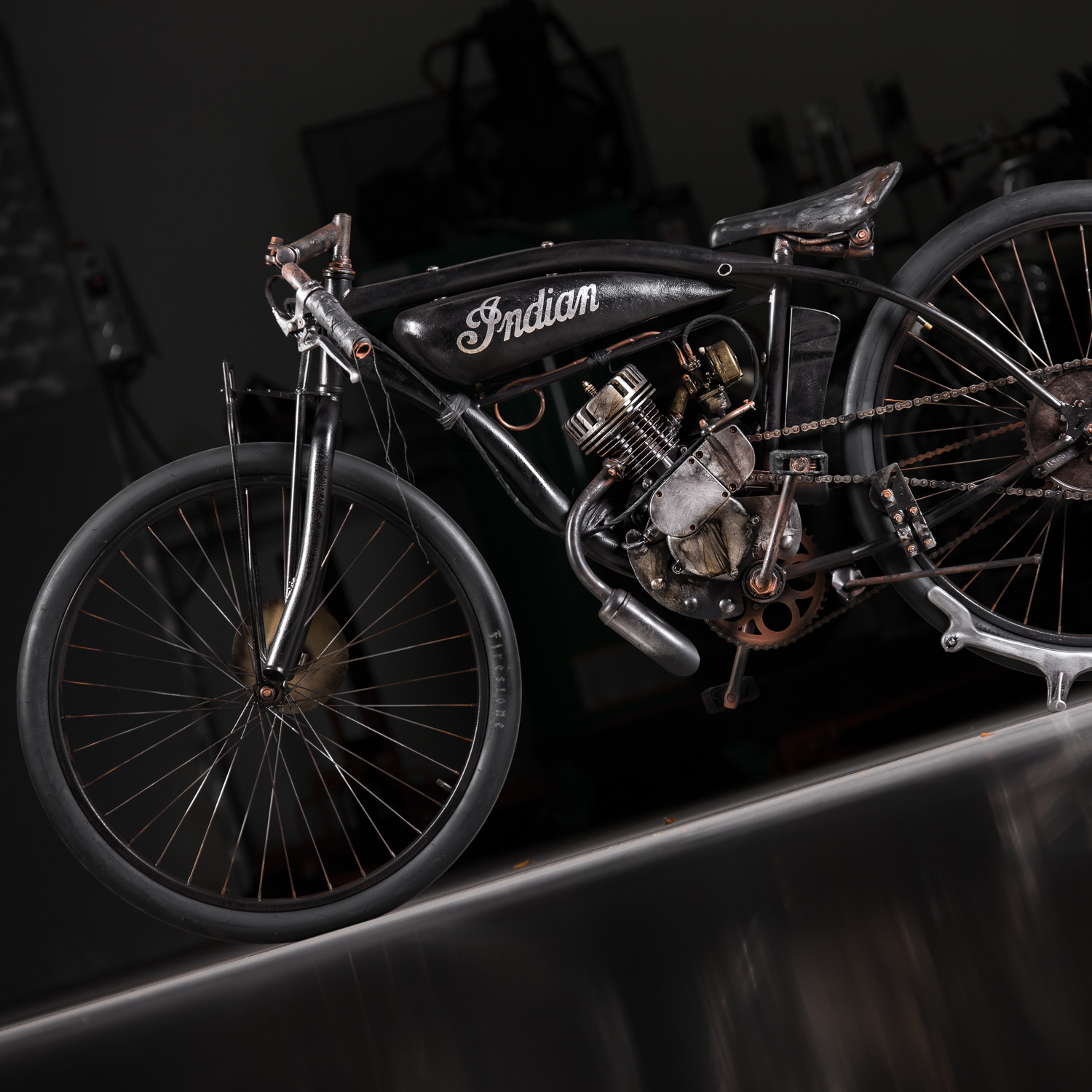 Created to pay homage to the early board track racing days of the past, the Bull Cycles Indian Board Track Racer tribute bike is a fully functional tribute to the 1920 Indian Daytona. The color is a beautiful black with hand cracked under-base and countless hours of detailed airbrush finishing to achieve the look of a well-aged motorbike. The finish is sealed, and there is no actual oil or grease used. The custom tig welded fuel tanks are made from ¼” aluminum and will not dent, rust, or leak. These bikes are fully functional and are powered by a 66cc two stroke motor. They can travel up to 30 MPH at roughly 80 MPG. Operating the bikes is simple, with an easy pedal start and twist throttle.