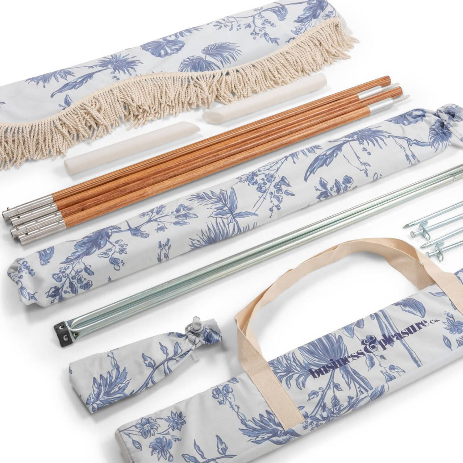 This portable tent is well-suited for the beach, lake, picnics, and camping. Crafted from sturdy cotton-blend canvas featuring a playful scalloped fringe, this item works equally well on both sand and grass. It offers UV protection for the entire family and better air circulation compared to regular pop-up shelters (providing 6 feet of shade when open). The package includes instructions, guide poles, and a convenient matching carrying bag.
