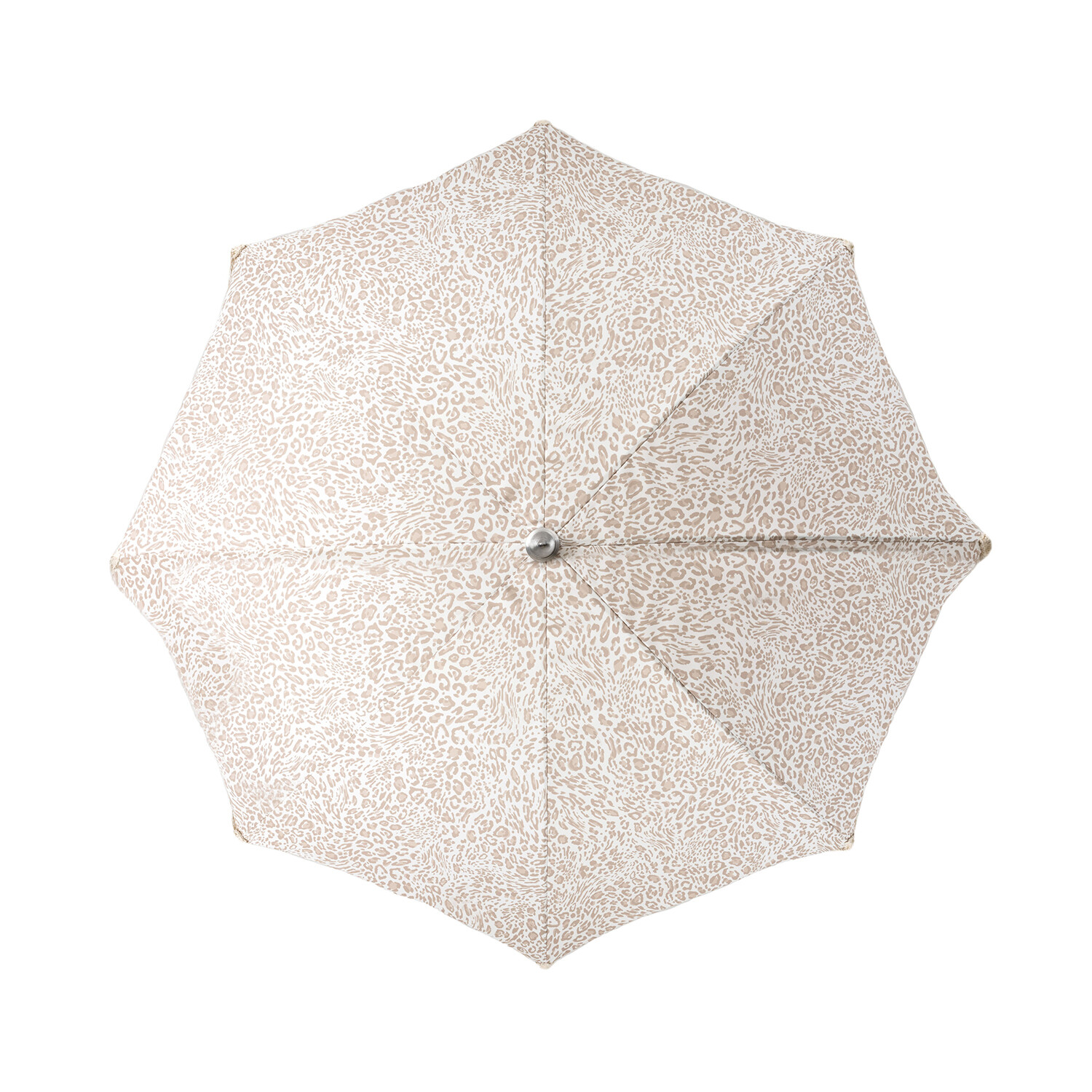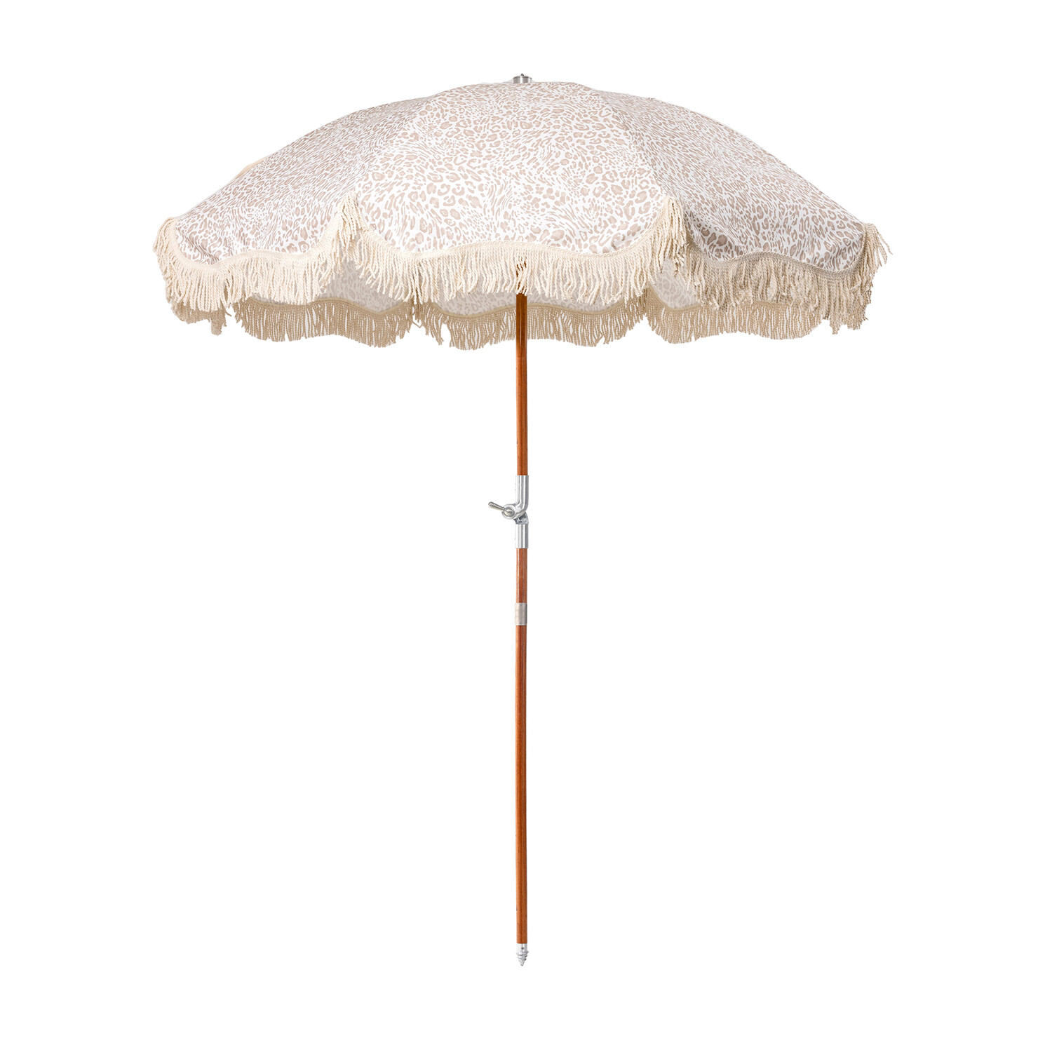 Despite its lightweight build, this umbrella offers an impressive six-foot diameter when open. It features a UV-resistant, water-resistant canopy adorned with a unique leopard print available only from this source. A whimsical cotton fringe adds a delightful finishing touch.