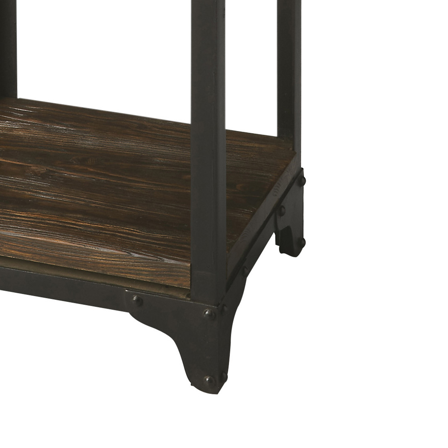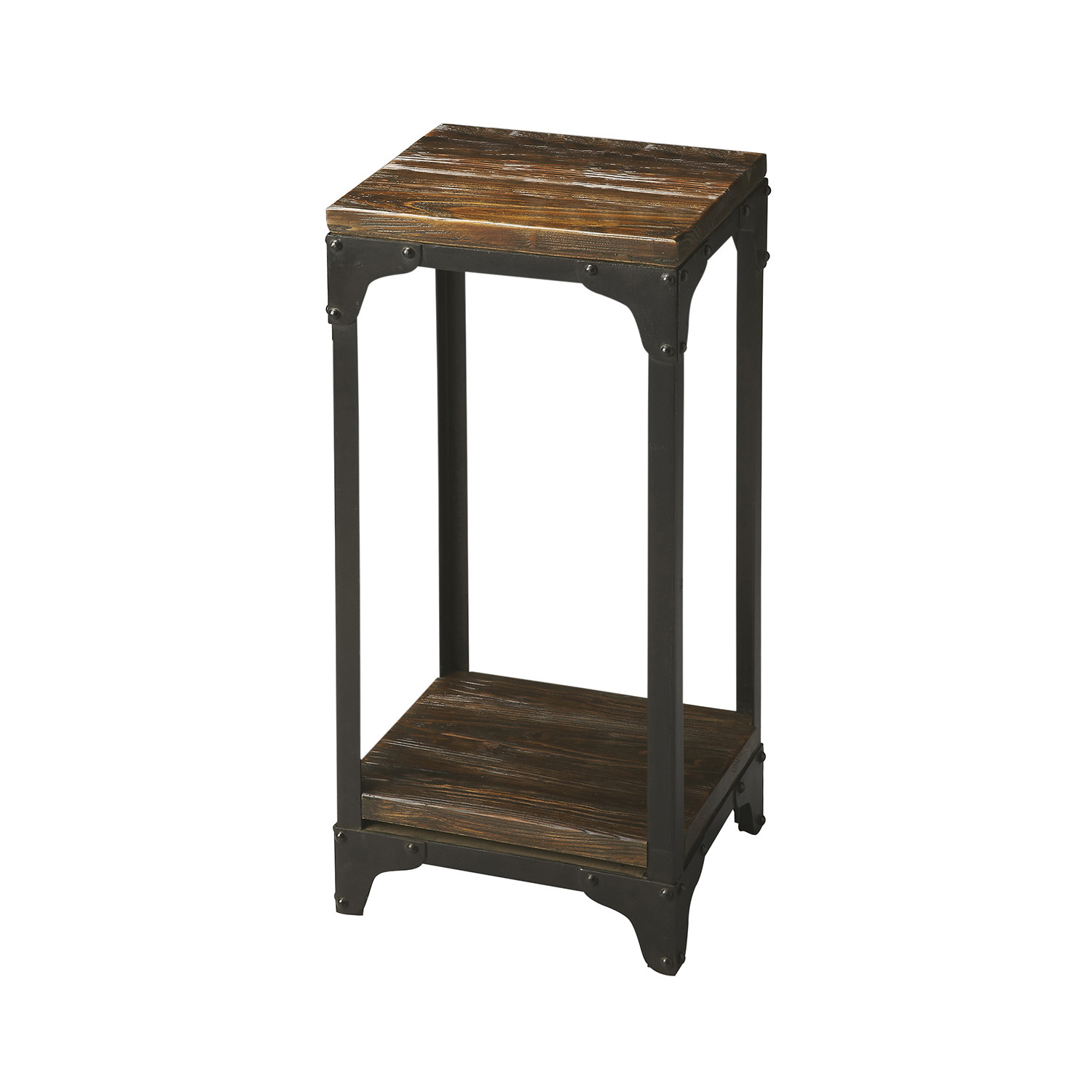 Hand-crafted from iron and solid acacia wood, the distinctive pedestal Bastien Stand is small in stance, yet rugged in appearance. Its black iron frame and burnt umber wood finish on the top and lower display shelf complement each other well.