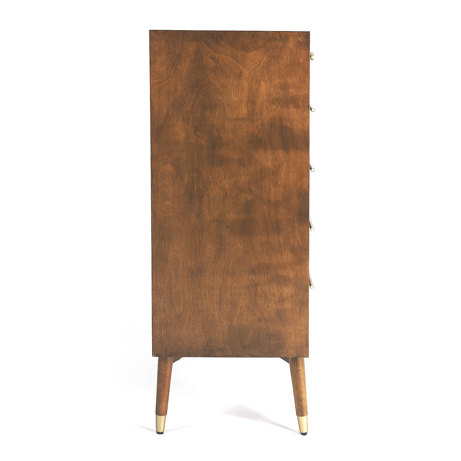 The Gisla Olice Ash Burl 6 Drawer Chest is crafted in Okume wood and Okume veneers to ensure durability, as well as provide the beautiful look of rich veneer graining. The multi-dimensional design of the drawer fronts on this drawer chest create a movement that takes your eyes on a journey, while the interiors offer extensive space for all your storage needs. The beauty of the brass finished hardware lends an edge of elegant simplicity to the overall style. The wood tapered legs and their brass finish ferrules give this piece undeniable attention to details.