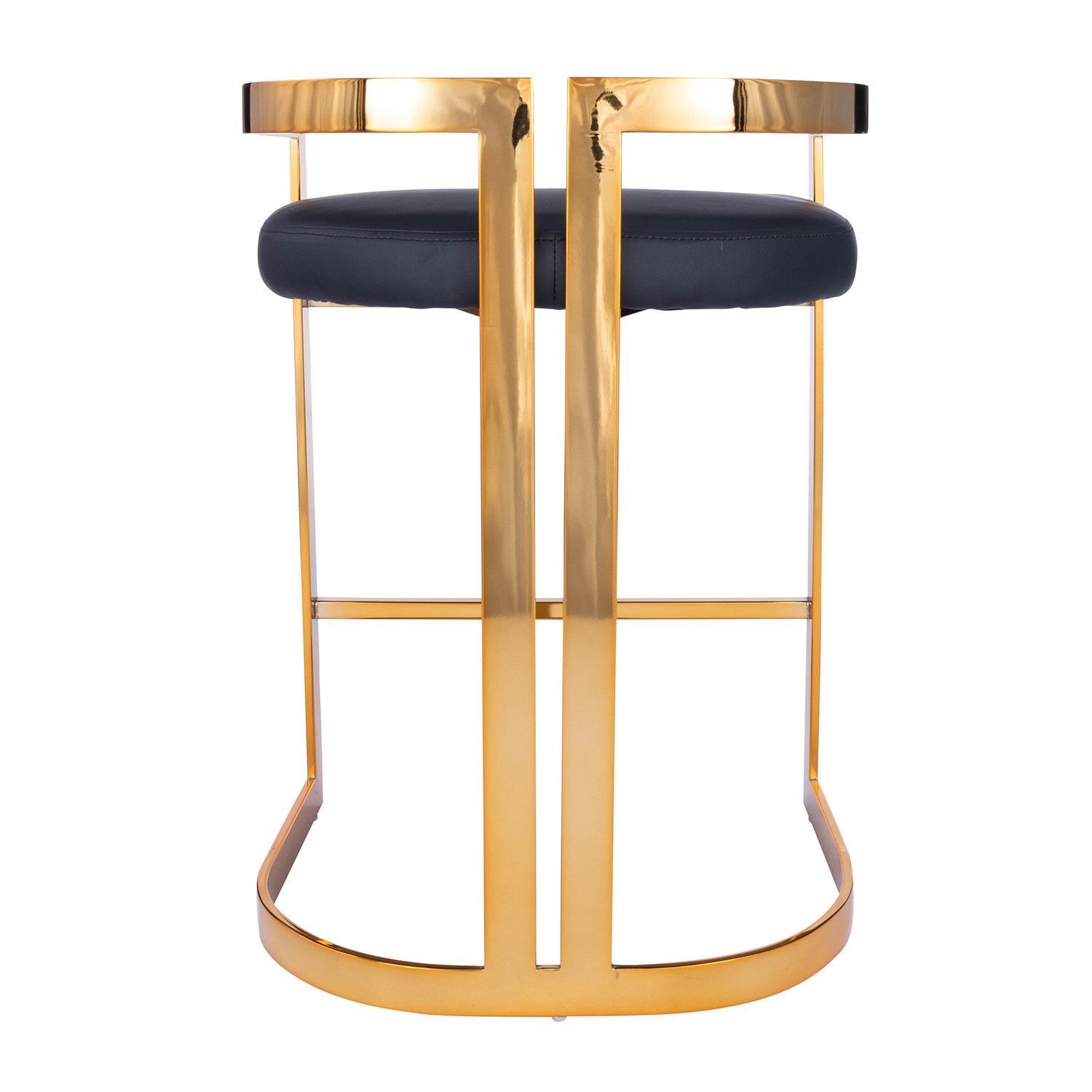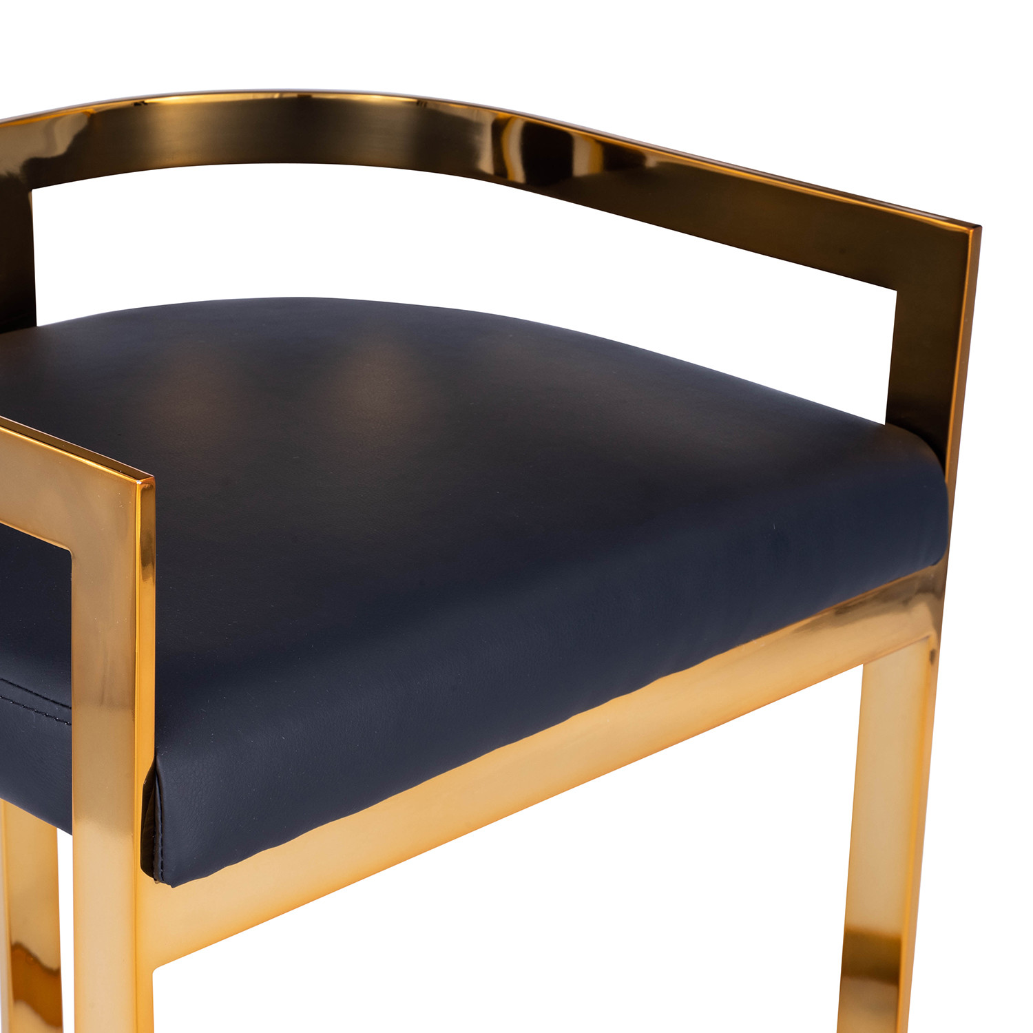 Furnish your kitchen or bar area in contemporary style with the Alessio Gold & Faux Leather Counter Stool. The high polish solid iron frame provides a sturdy base, while the plush faux leather seat ensures maximum comfort. The combination of angles and gentle curves gives this stool an eye-catching appearance, while the neutral color allows it to match well with any decor.