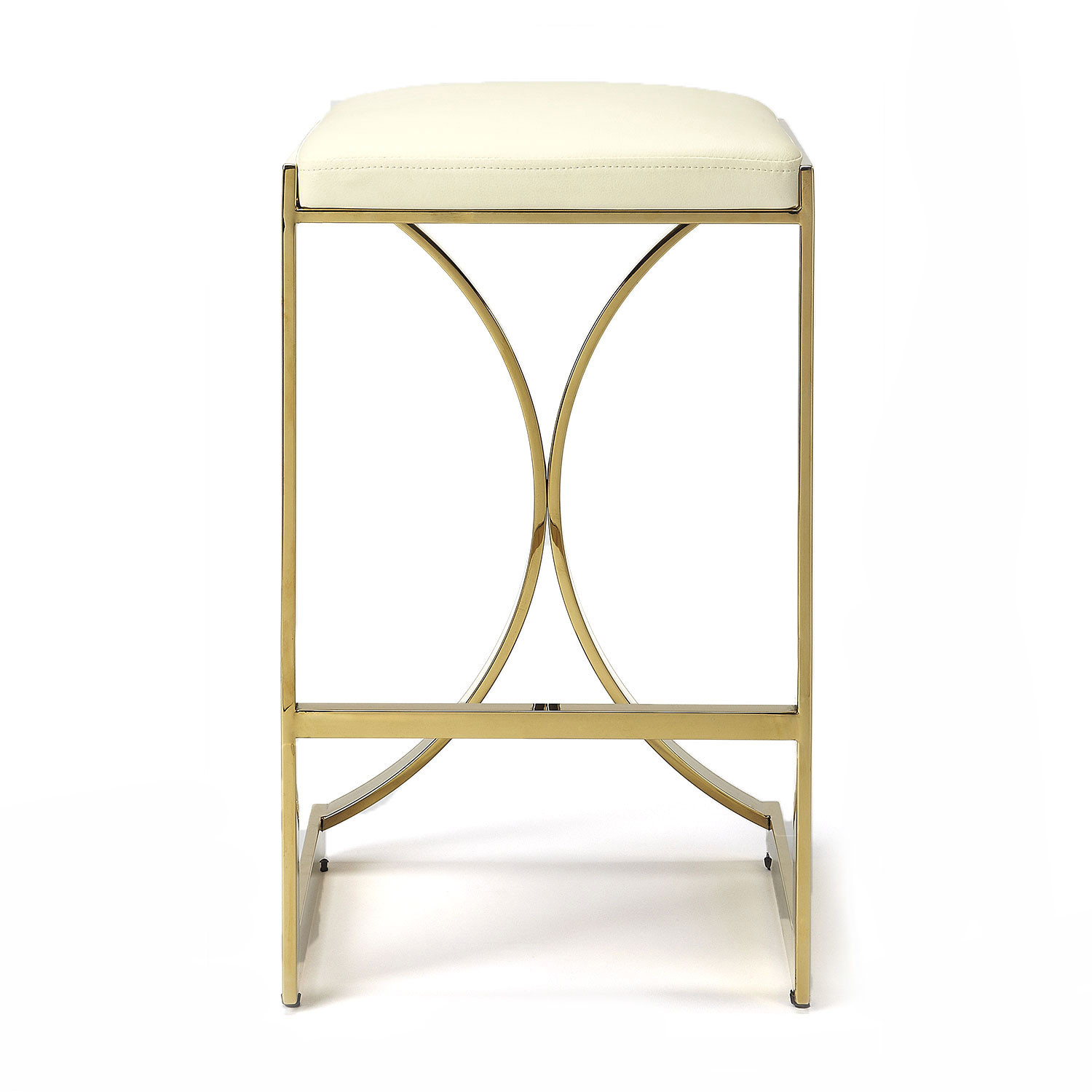 Furnish your kitchen or bar area in contemporary style with the backless Italo Gold Counter Stool. The high polish solid iron frame provides a sturdy base, while the plush faux leather seat and footrest ensure maximum comfort. The combination of angles and gentle curves gives this stool an eye-catching appearance, while the neutral color allows it to match well with any decor.