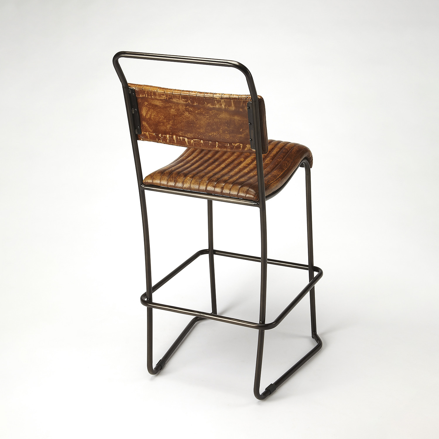 Pairing a black finished metal base with a ribbed leather seat, the Marceau Bar Stool brings a bit of sturdy and rustic industrial style to your space, with its curvaceous seat and supple leather it is sure to delight. Cluster several at your kitchen island to gather friends for appetizers or lazy Sunday brunches, or set a pair in the living room with a Roundtop pub table to create a cozy conversation nook in your entertainment space.