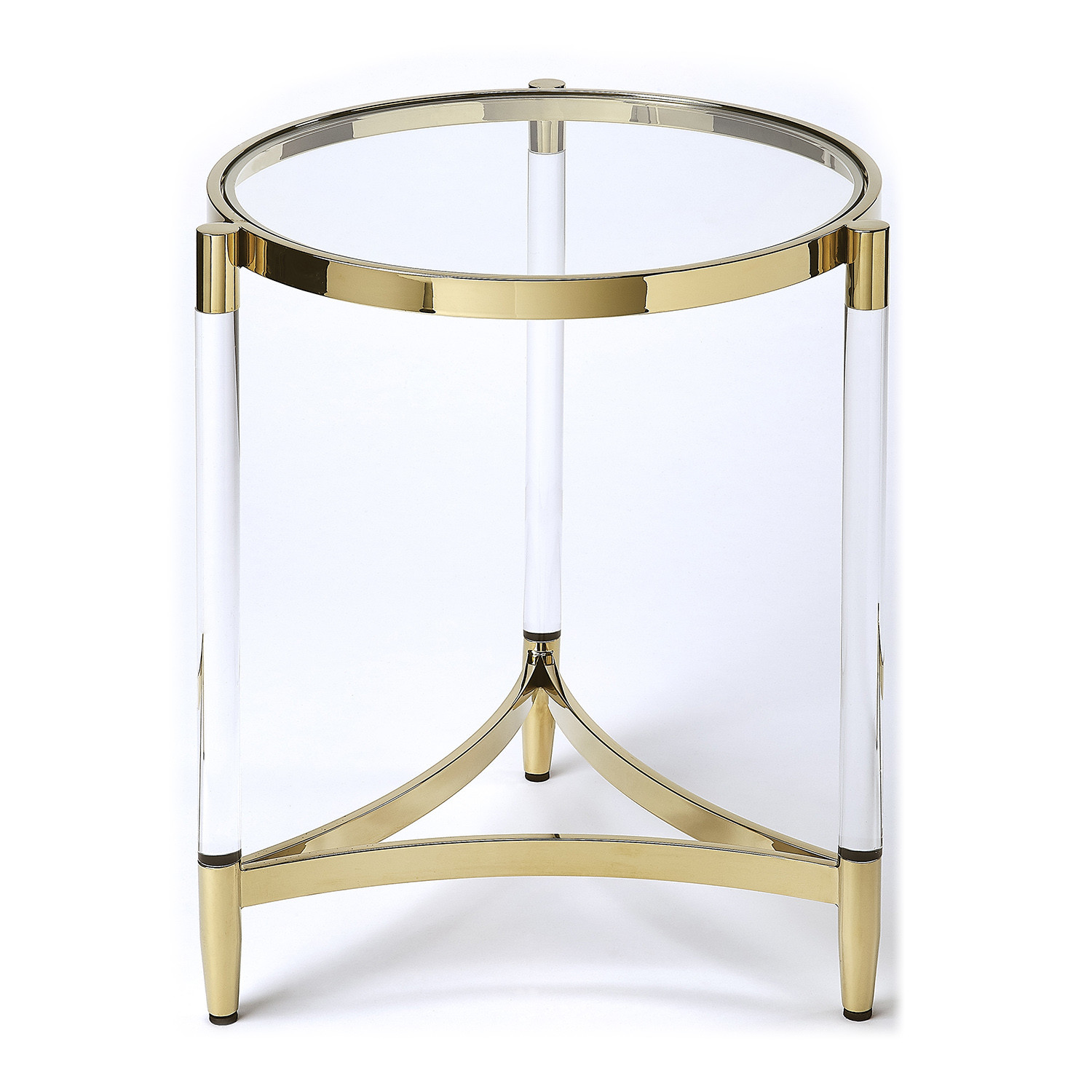 High polished gold finish stainless steel lends a sophisticated appeal to the clear-acrylic frame and glass top of this contemporary Round End Table. The clear-acrylic legs add a simplistic beauty and the high polished metal finish in a brilliant gold add the shine that will be noticed by all.