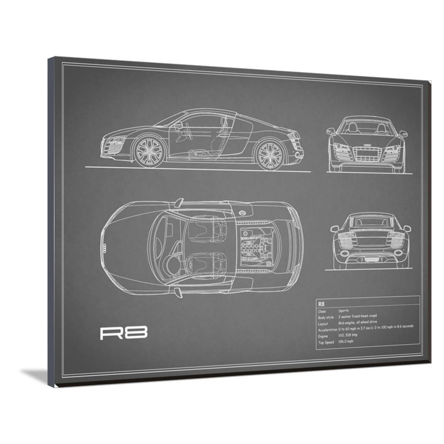 Show off your love of cars, of science, of history, and of art, with this mind-boggling collection of artistically-rendered patent and blueprint diagrams for real cars. See the inner workings of the Aston Martin DB4, or the exact silhouette of the Corvette C3, displayed on high-grade canvas with a dash of vintage. It's a serious step up from photos or posters.