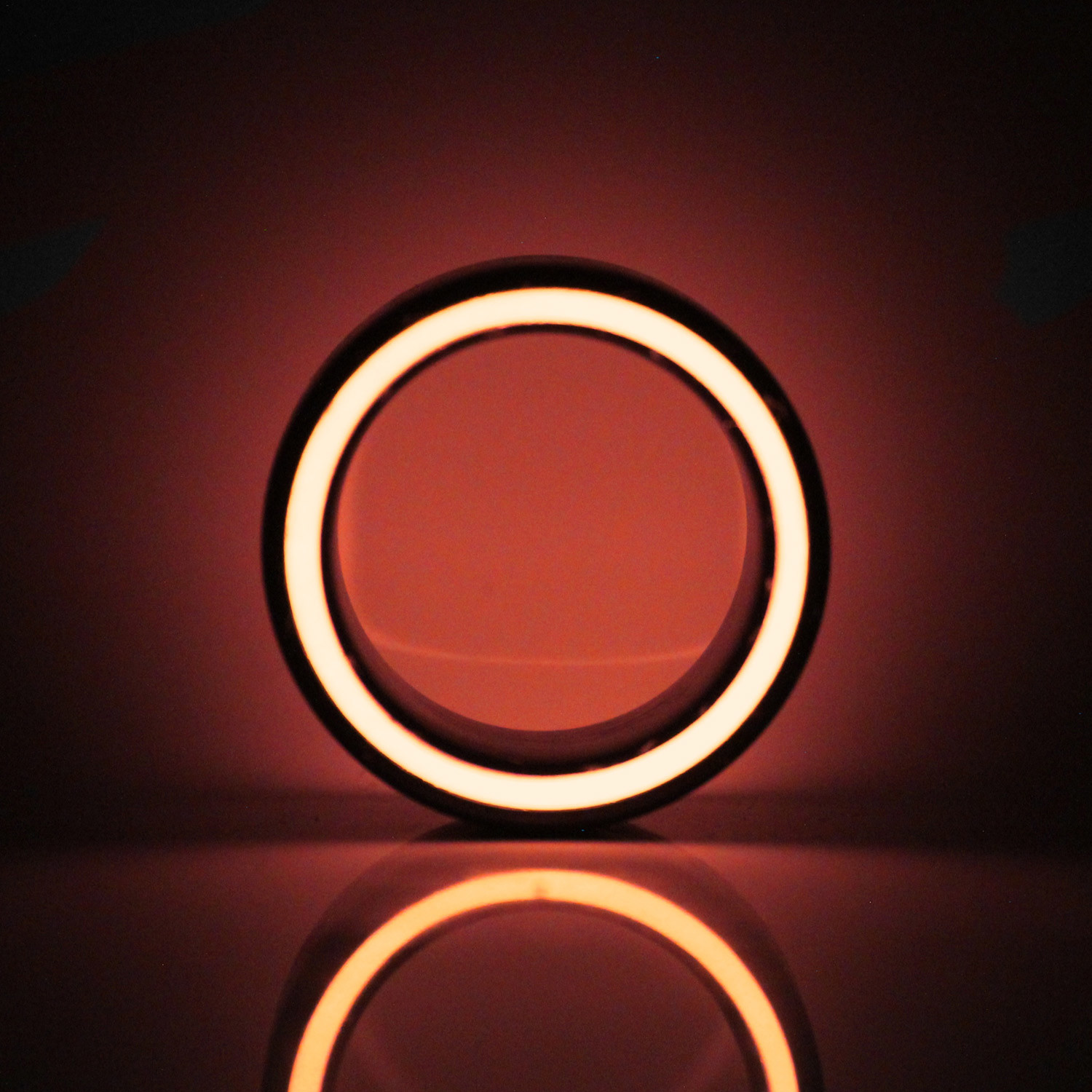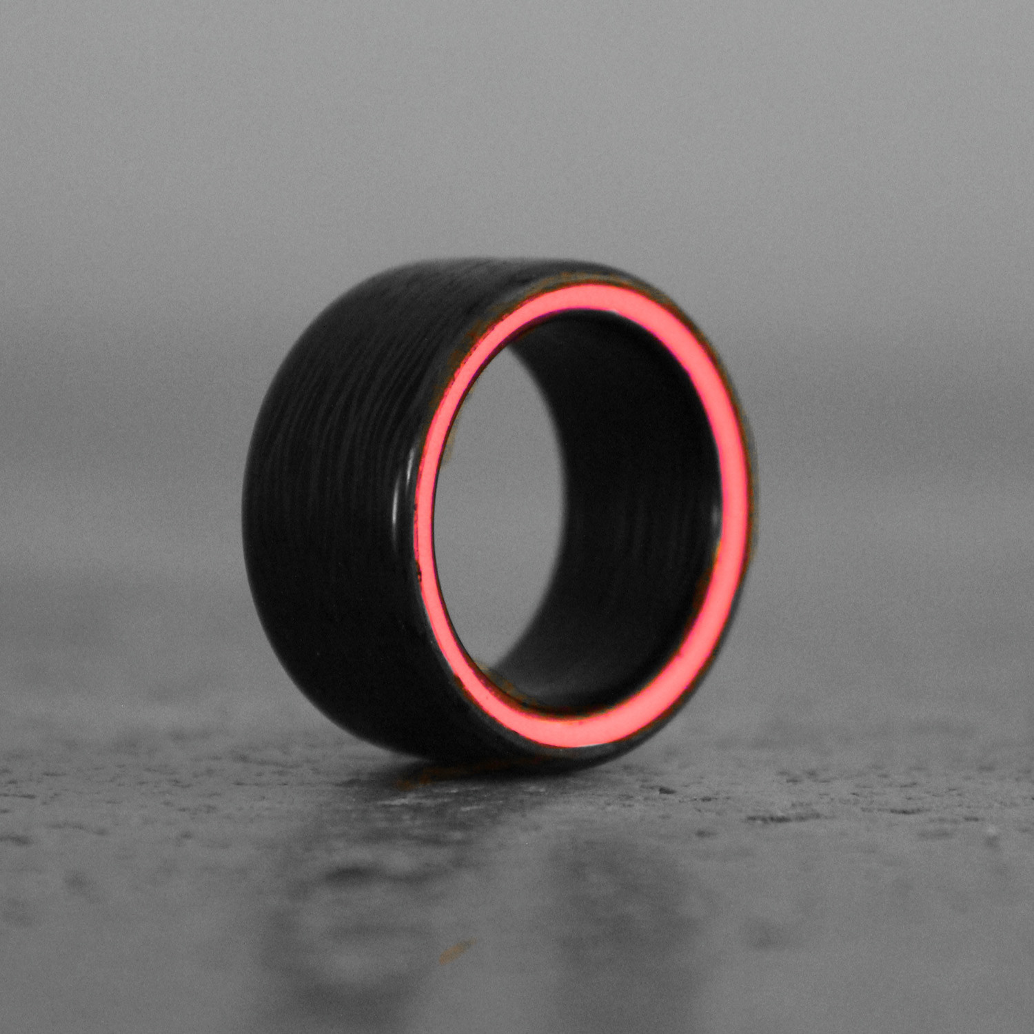 Carbon fiber by day, glowing light by night. This ring glows brightly in a vivid color - only under UV light, for a magically changing detail that switches from understated to fun and funky in a flash.