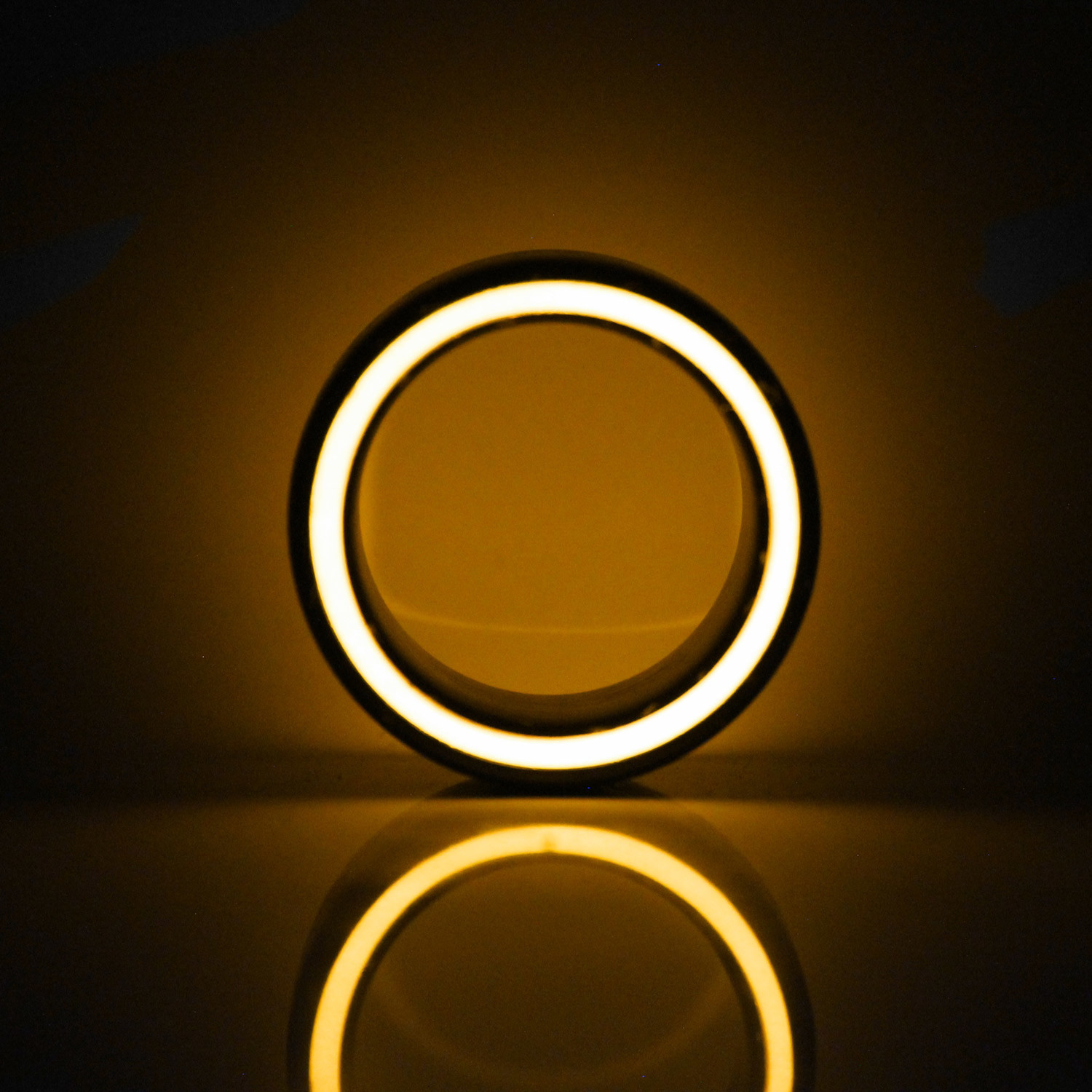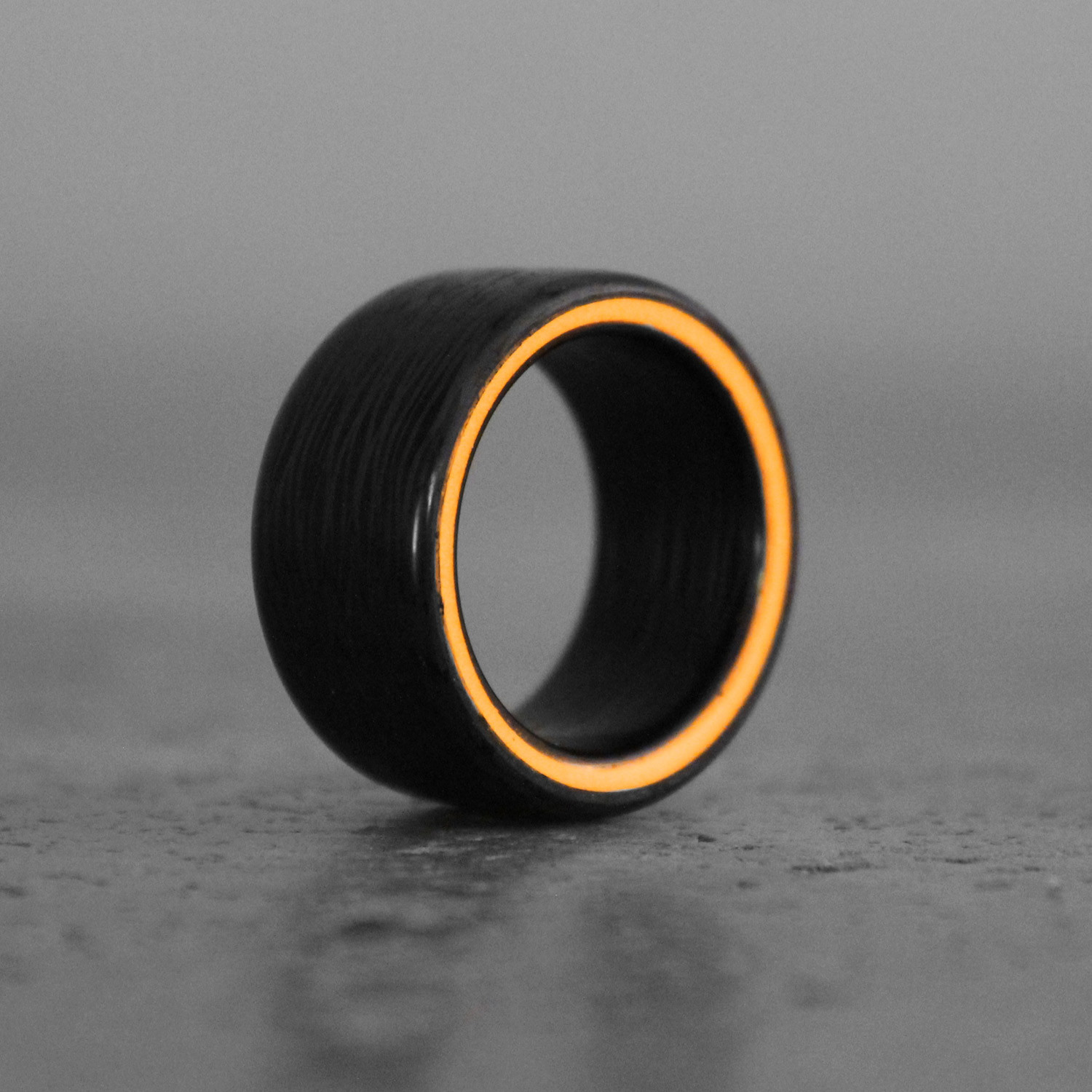 Carbon fiber by day, glowing light by night. This ring glows brightly in a vivid color - only under UV light, for a magically changing detail that switches from understated to fun and funky in a flash.