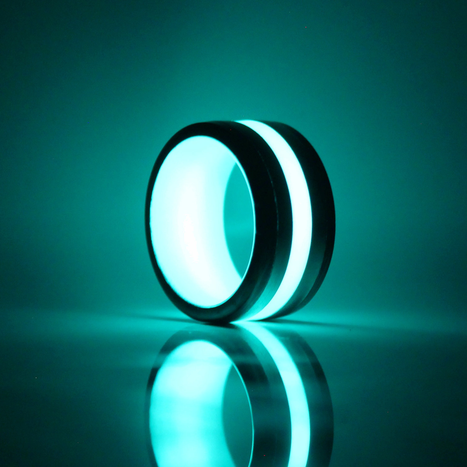 Carbon fiber by day, glowing light by night. This ring glows brightly in a vivid color - only under UV light, for a magically changing detail that switches from understated to fun and funky in a flash.