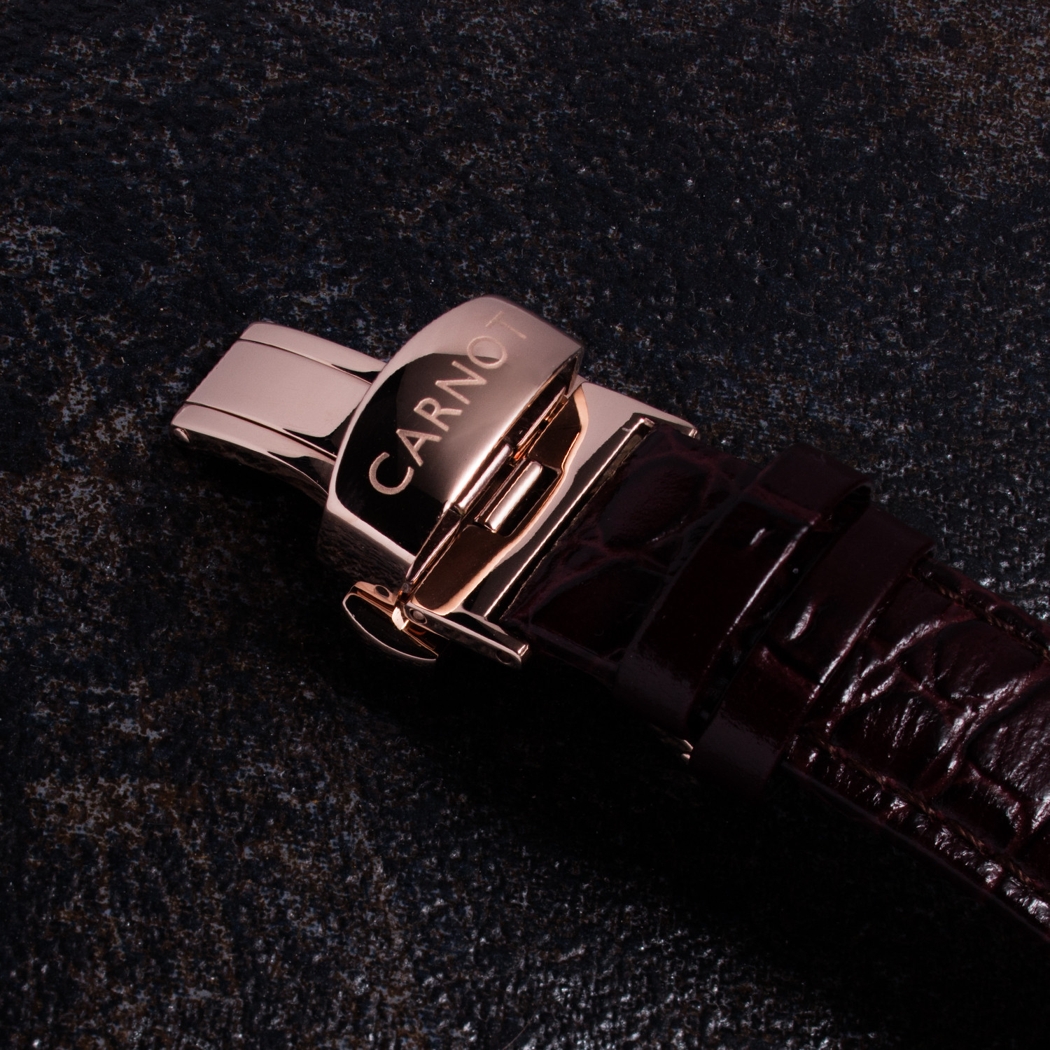 Inspired by the Cote d'Azur, the playground for the rich and famous, the Carnot Riviera combines the glamour and the lovable feel of the French Riviera, capturing the essence of modern luxury into this unisex watch. Featuring a rose gold color case with a unique textured white dial and crocodile-grain embossed black leather strap, this watch feels right at home at a fancy cocktail party or at an intimate relaxed dinner by the sea, feet in the sand. Treat your wrist to a Carnot Riviera because whatever way you choose to spend your time, you should look amazing in keeping track of it!