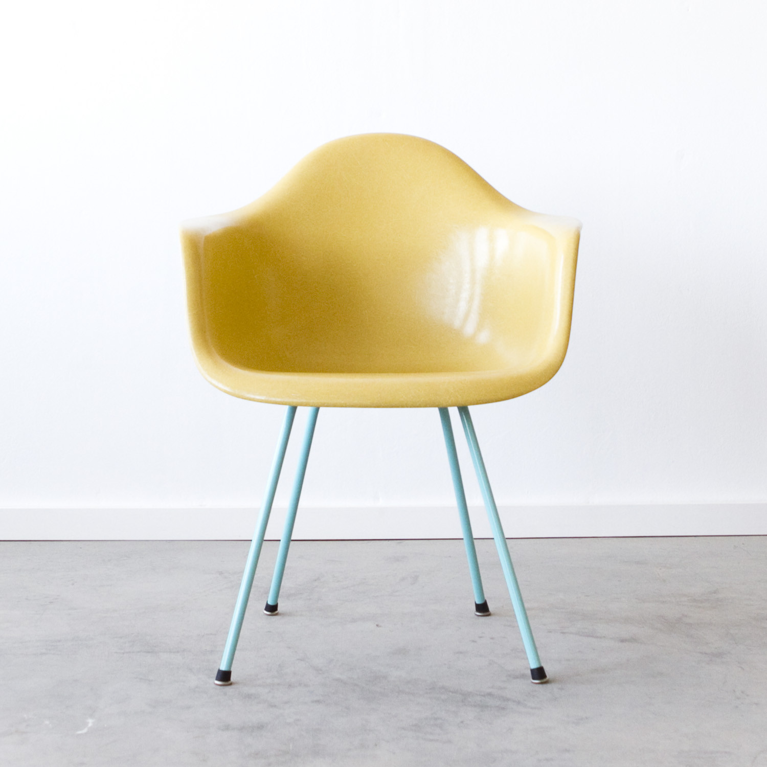 Comprised of all vintage parts, this DAX chair model in "ochre" fiberglass presents elegantly upon its early Eames X base—freshly restored with a flawless powder-coated finish in Cast & Crew's signature mist blue. The vintage shell retains its original sheen and finish as well as all four original shock mount fasteners in fantastic condition.