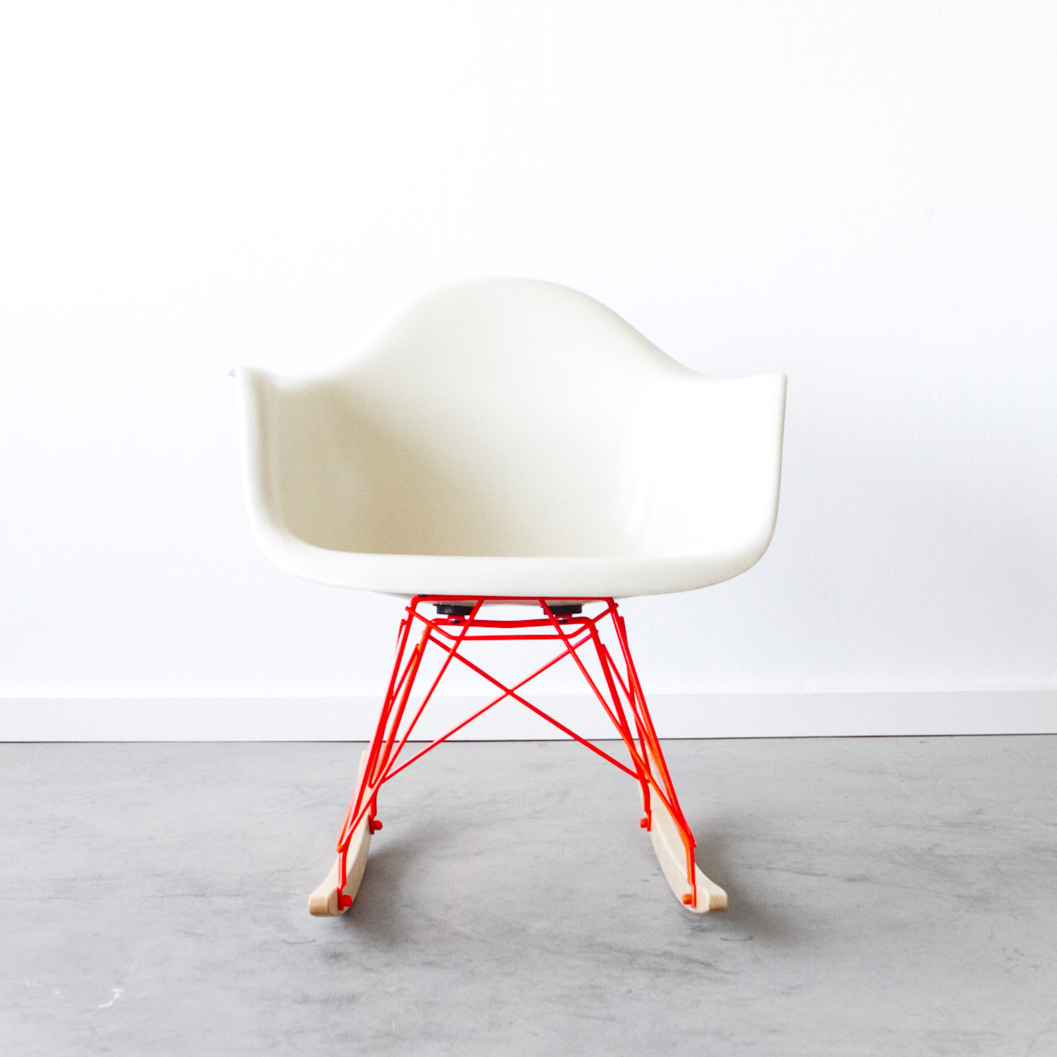 This authentic vintage Eames design is taken to the next level with Cast & Crew's signature neon red rocker base featuring beautiful blond maple wood runners. The parchment colored fiberglass shell retains its original finish as well as all four of its original shock mounts, all in excellent condition. Identified as an early 1960's production, this chair holds the mark of the "Star C" embossment - a sign of its birthplace at Herman Miller's Cincinatti Milicron factory. With no other chair alike, Cast & Crew is proud to offer this one-of-a-kind Eames collector's piece.