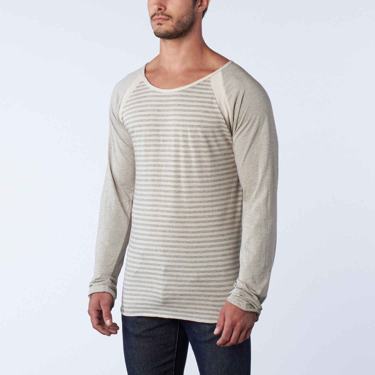 The Maier Longsleeve Raglan is all about the unusual blocking. Two thicknesses of stripe are spliced together with pure white bands to showcase its construction.