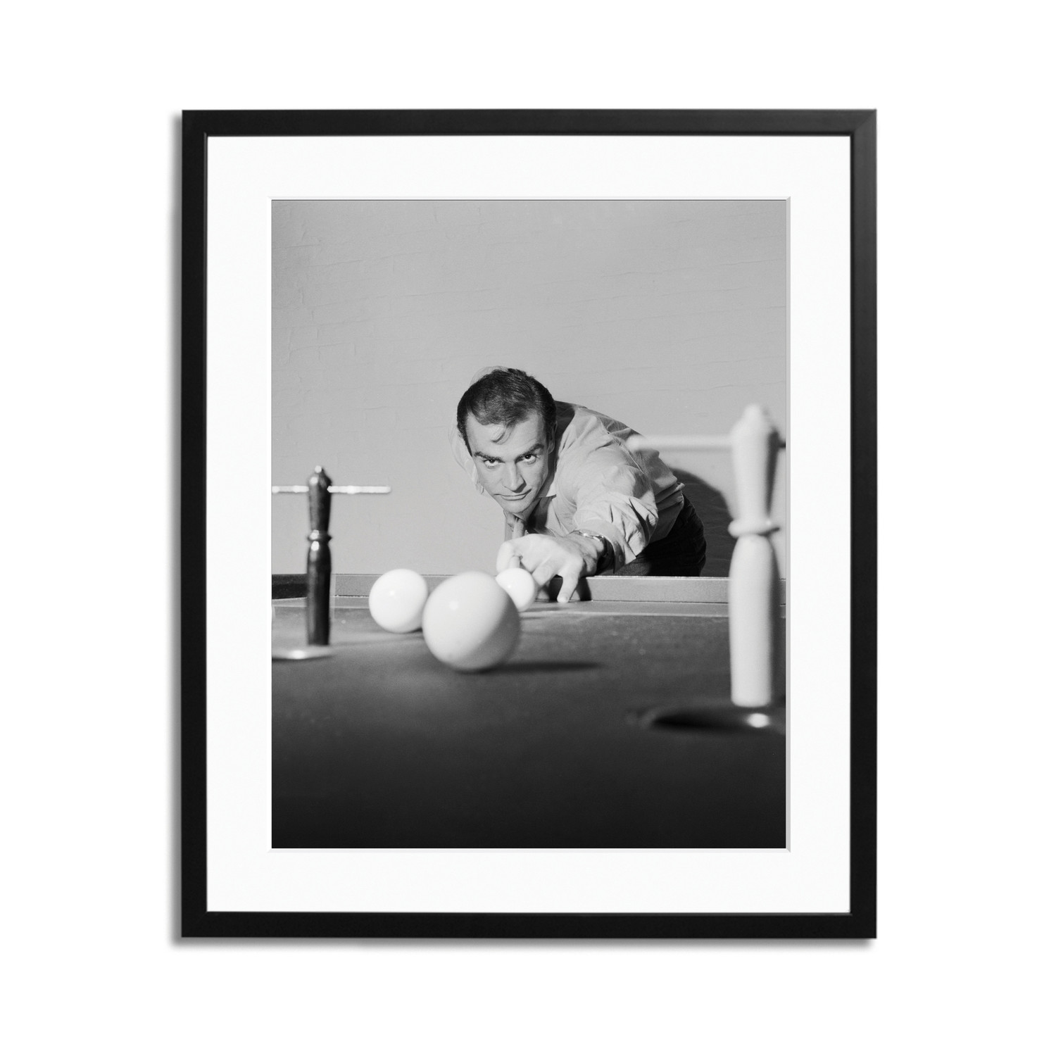 This nostalgic and artistic high-contrast print features Scottish actor Sean Connery, the face of superspy James Bond, enjoying a game of bar billiards at his basement flat in London's NW8.