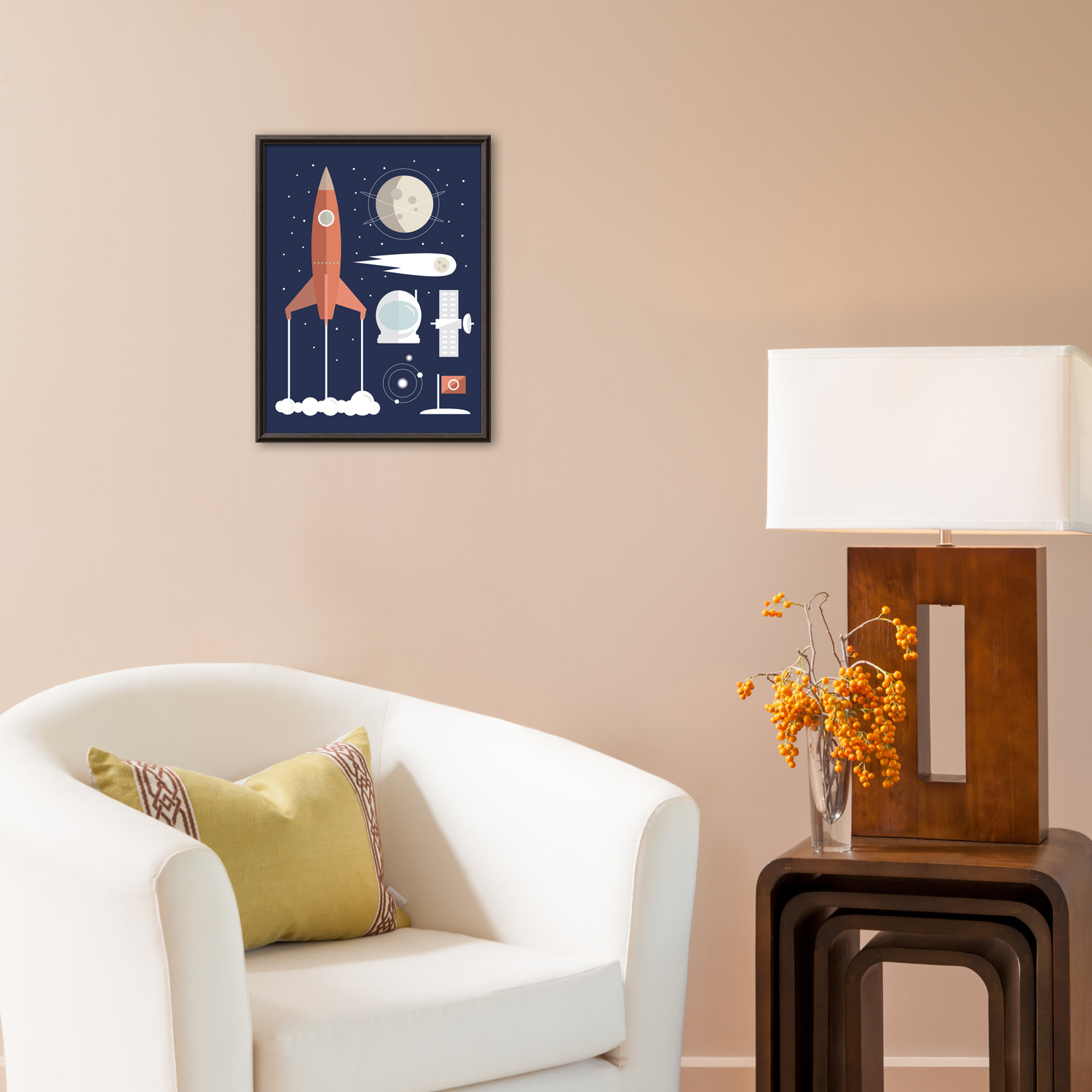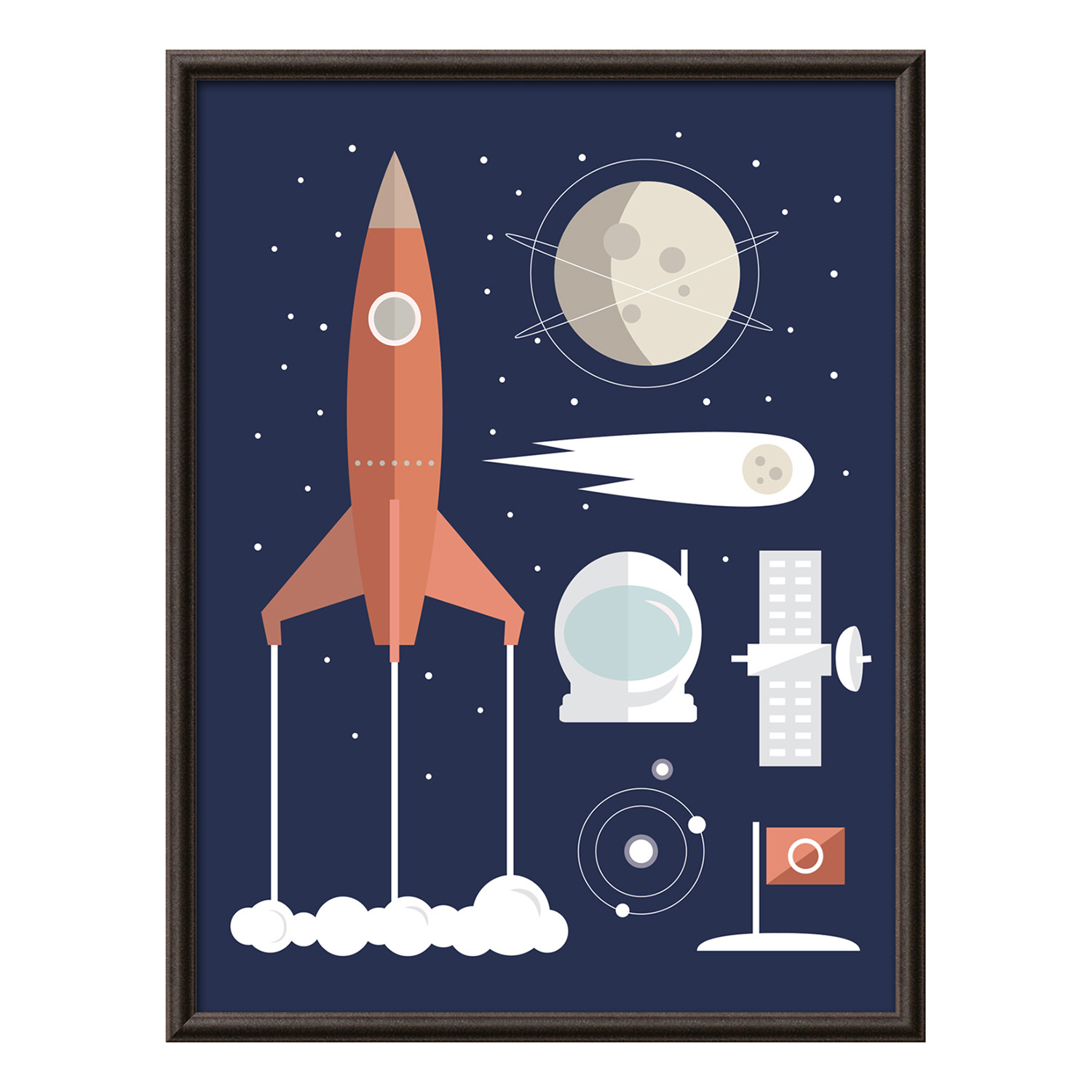 Framed in sleek metal, this incredible piece by The Glass Mountain features a whimsical representation of colorful space travel motifs. Hang it on your walls, and bring science, history and art into your own, personal space.