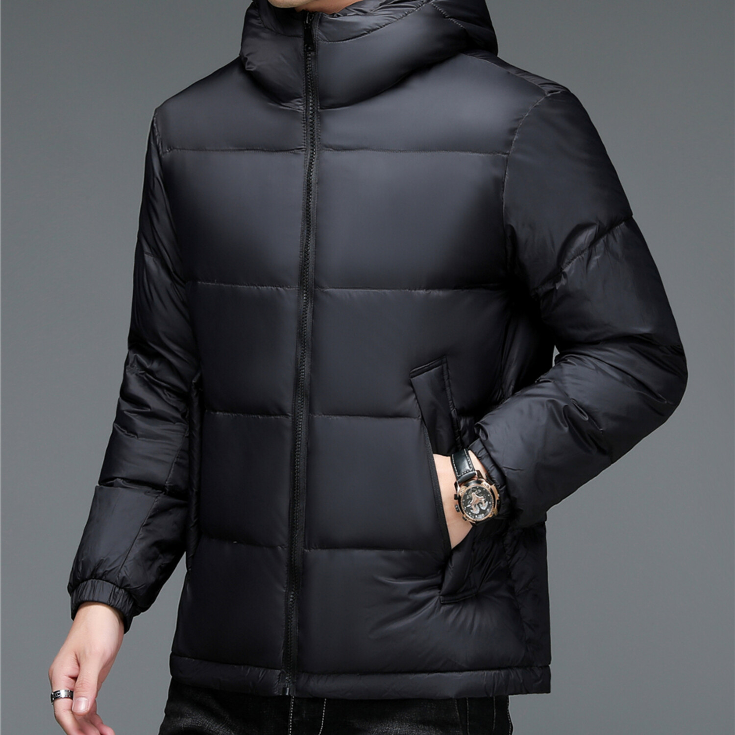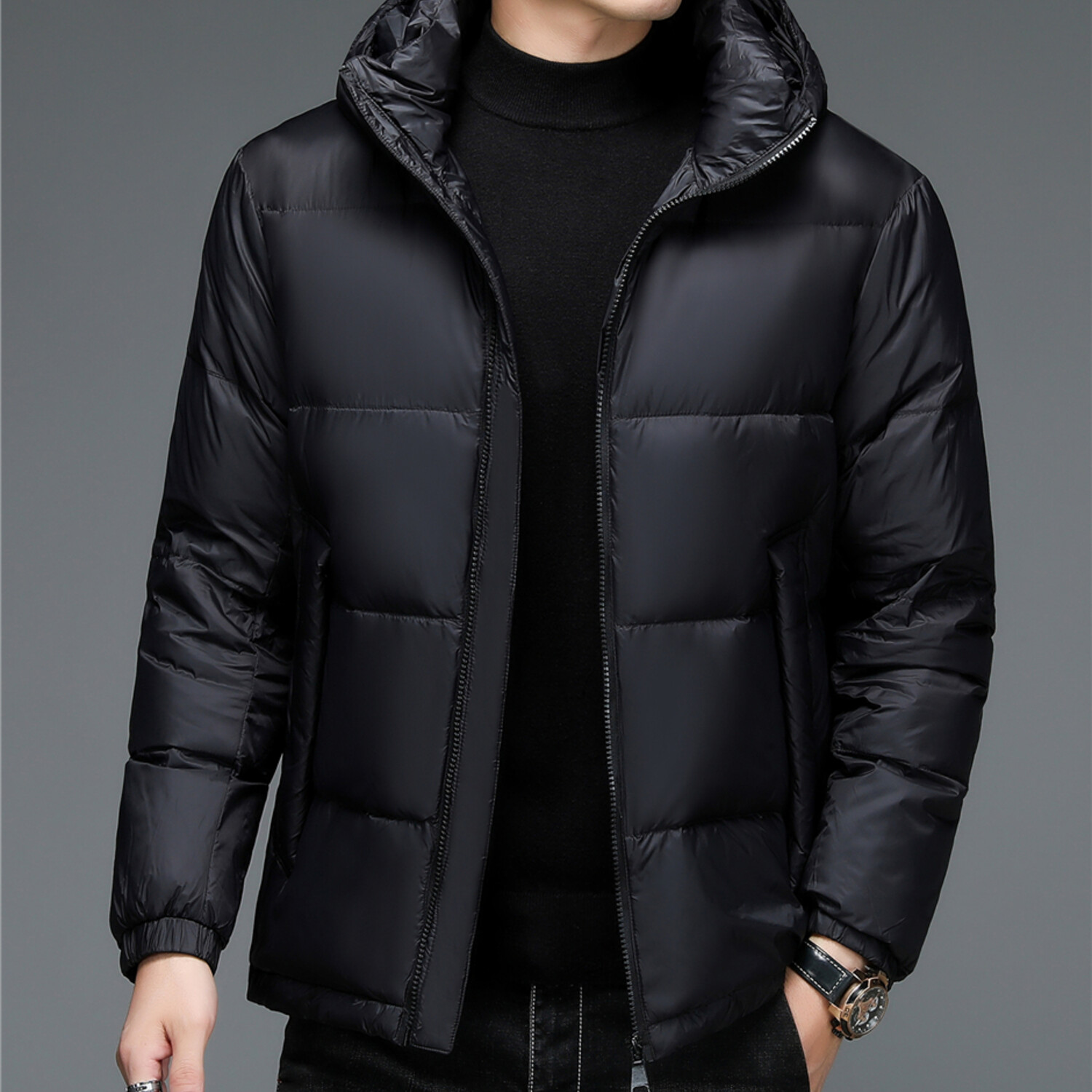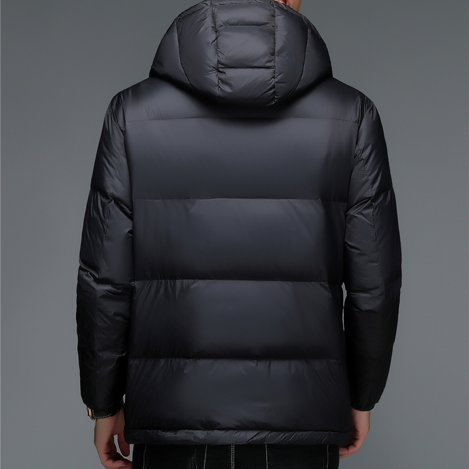 This down jacket is a sophisticated outer layer garment made with a duck down and feather.