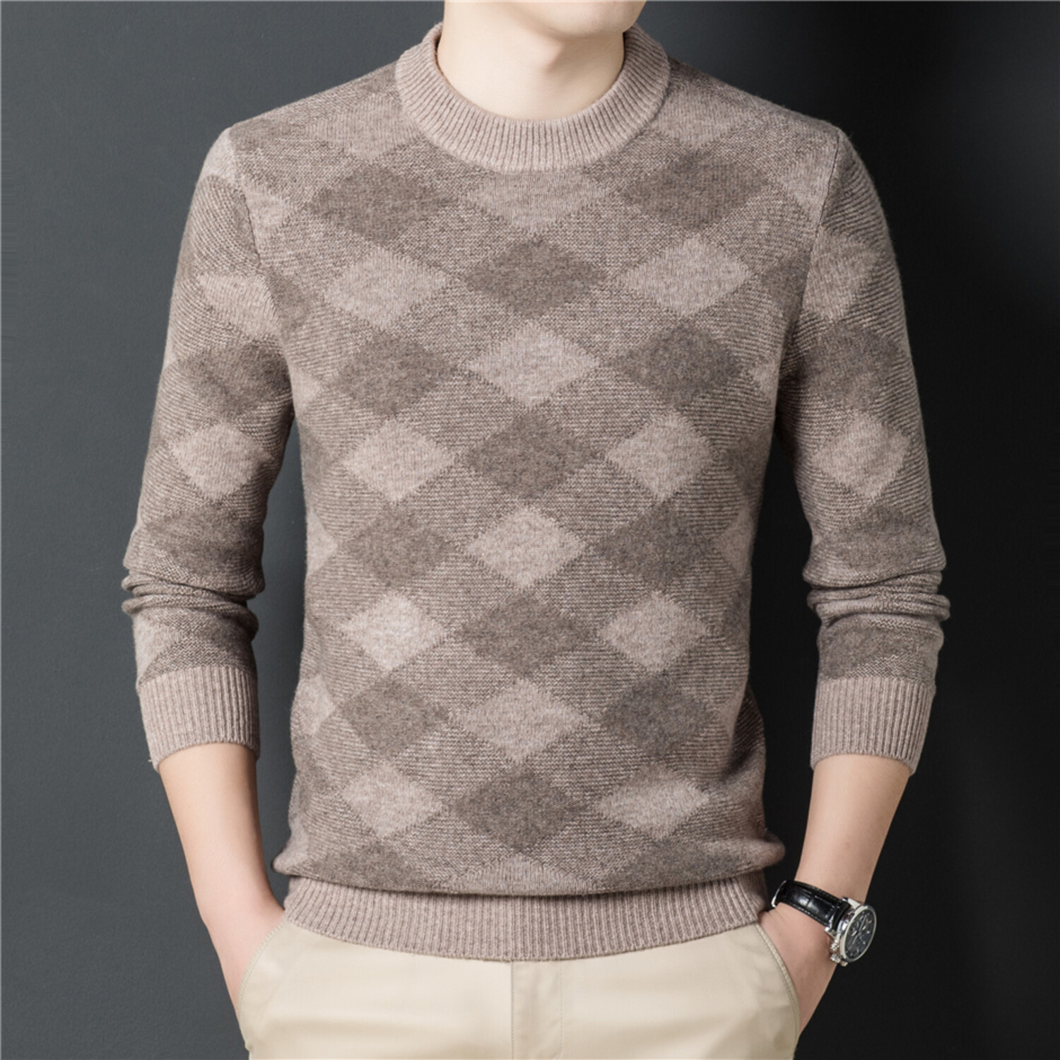 008 Crewneck Merino Wool Checkered Sweater // Tan