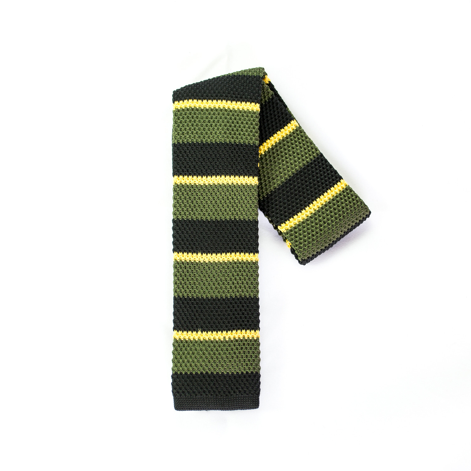 This handmade, silk square knit tie is great for all occasions calling for a little extra style. Its army green, black and yellow striped weave looks great with cardigans and suits alike.