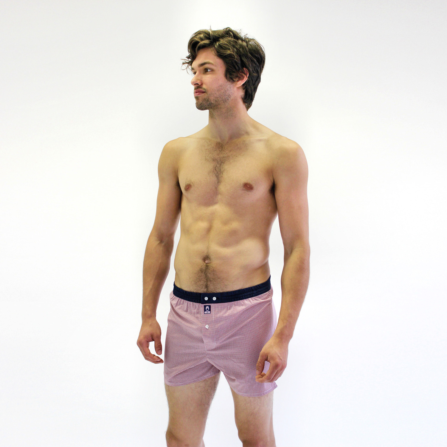 Traditional boxer shorts are loose-fitting and easily bunch up under pants. Briefs or boxer-briefs are often too tight, not allowing air where air is needed. The solution is Charles Van Der Pear's proprietary slim-fit luxury boxer shorts with inner support for superior comfort and fit. Constructed from seven individual parts, this red and dark blue tailored boxer combines the support provided by a boxer-brief, but with the looks of a boxer.
