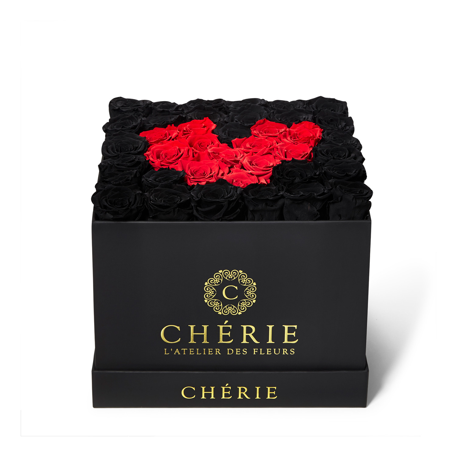 This decadent offering features a custom, black suede box adorned with Swiss-made gold foil. Inside, you'll find a flawless arrangement of black and red roses. These special Chérie roses, when kept in the box and away from sunlight and moisture, will retain their scent for months, and can even stay fresh for up to a year.