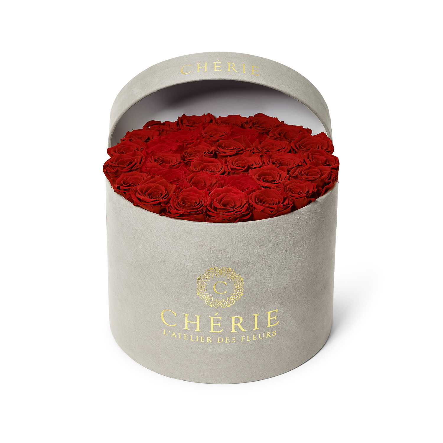 This sleek and sexy take on flower arrangements offers approximately 32-38 red roses in a luxe, Parisian-inspired round box wrapped in custom-made grey microsuede, and adorned with Swiss-made gold foil and matching ribbons. These special Chérie roses, when kept in the box and away from sunlight and moisture, will retain their scent for months, and can even stay fresh for up to a year.