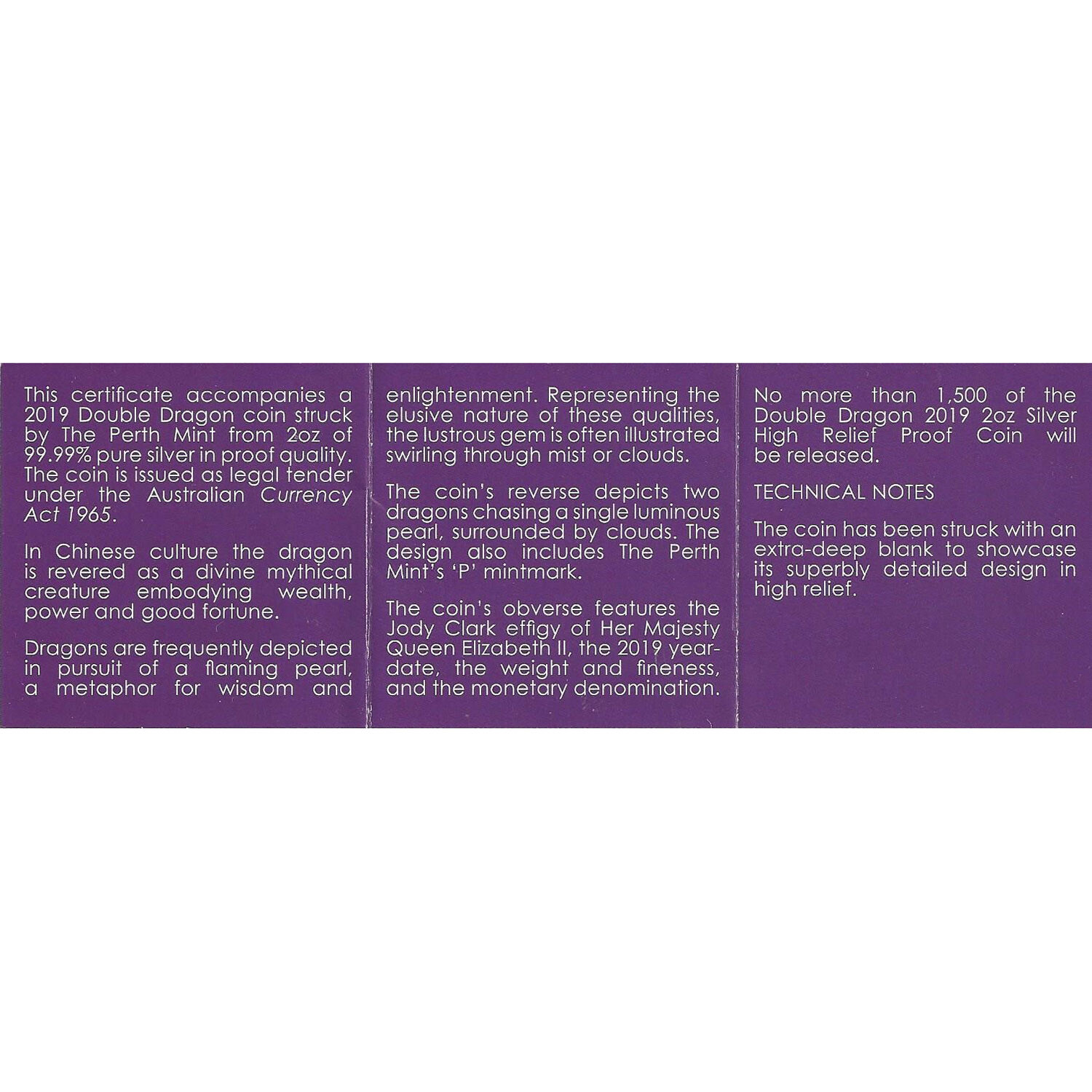 The coin depicts two dragons chasing a single luminous pearl surrounded by clouds. Dragons are frequently depicted in pursuit of a flaming pearl, which is a metaphor for wisdom, prosperity, power, and enlightenment. The pearl is often illustrated swirling through the mist or the clouds in this case.
