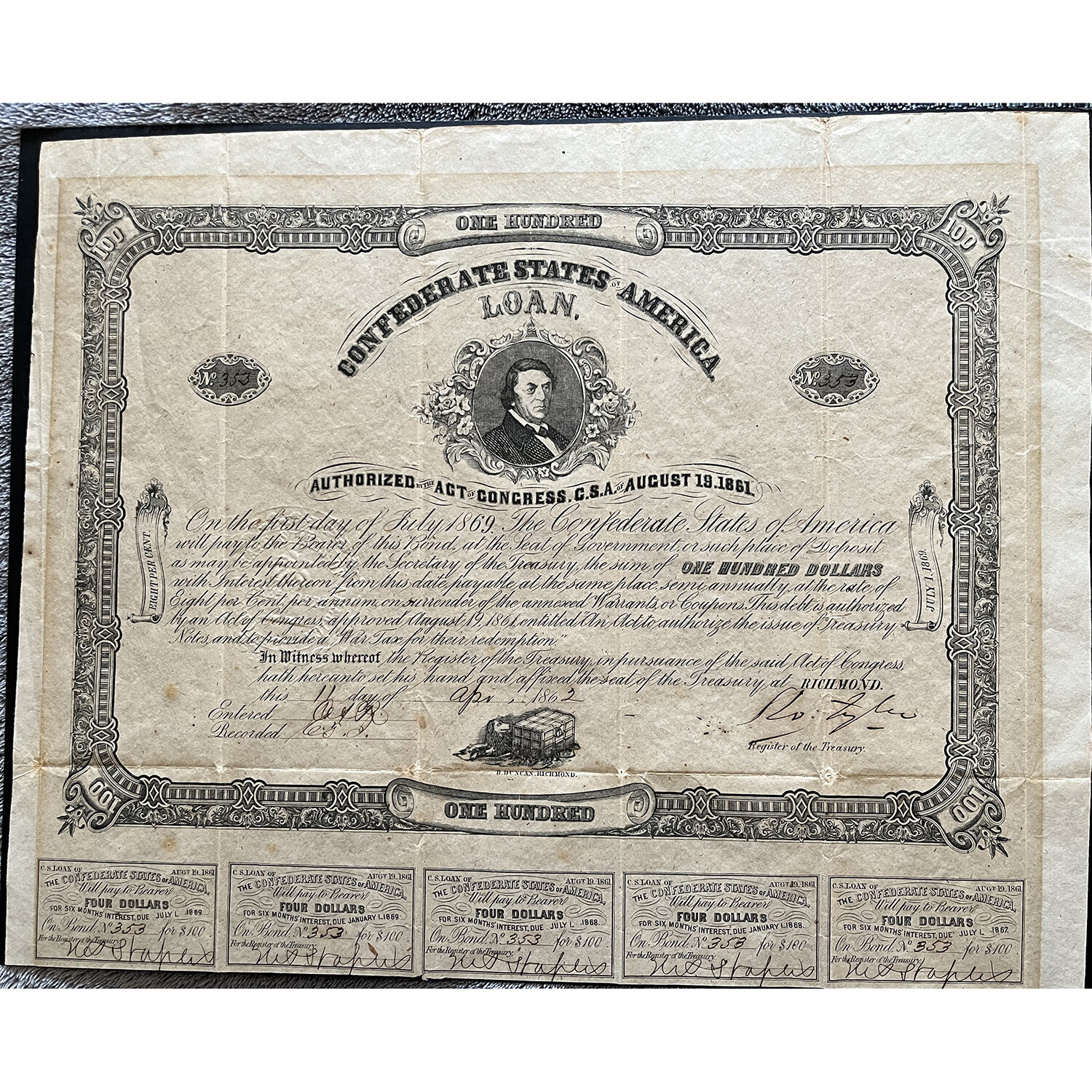 An authentic 1861 Confederate States of America “LOAN” with the portrait of Robert M.T. Hunter, Secretary of War 1861-62. The note was fully signed and issued on April 11th, 1862. This “LOAN” was purchased exactly 1 year after The Civil War had started.