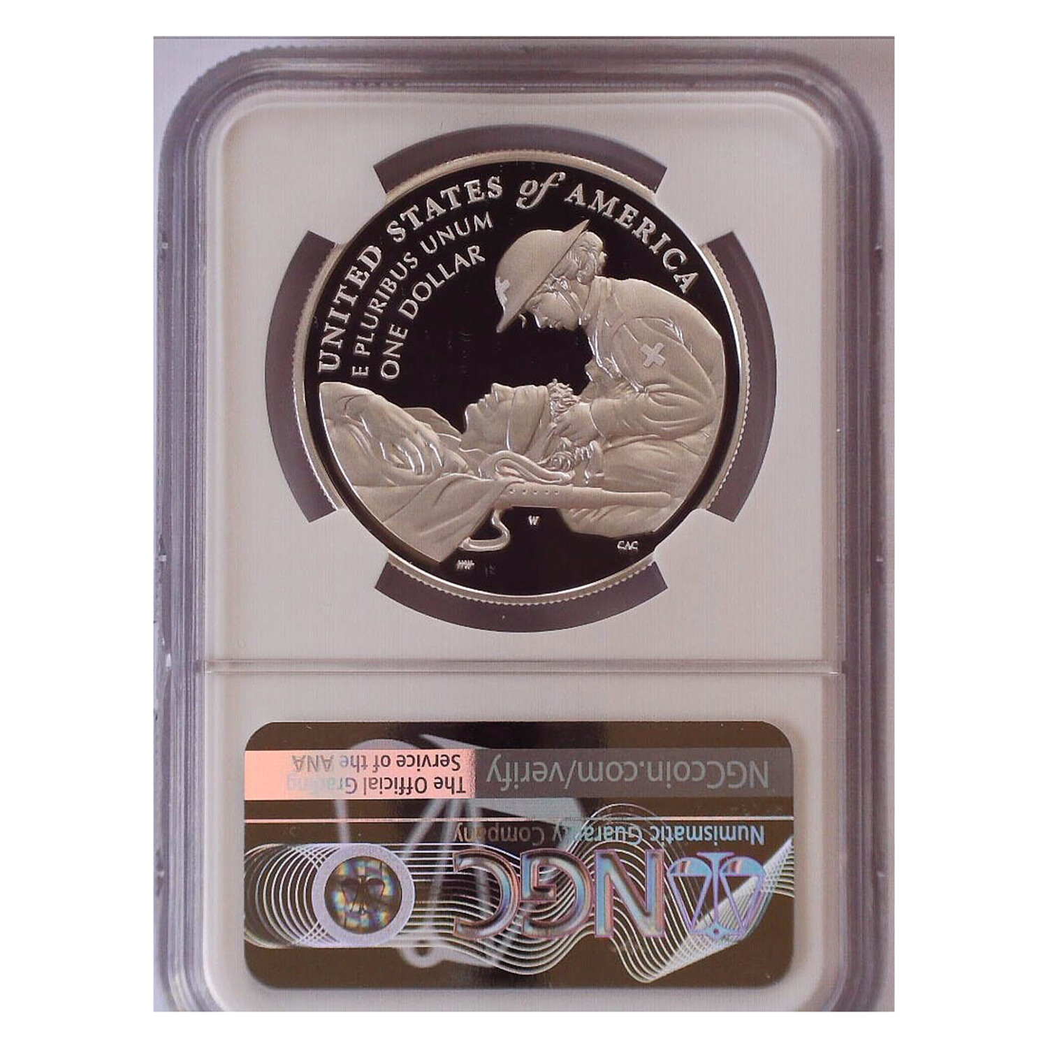 The reverse (tails) design shows a woman in a World War I helmet as she bandages a wounded soldier on a stretcher. More than 23,000 women nurses served in the Army and Navy during the war.