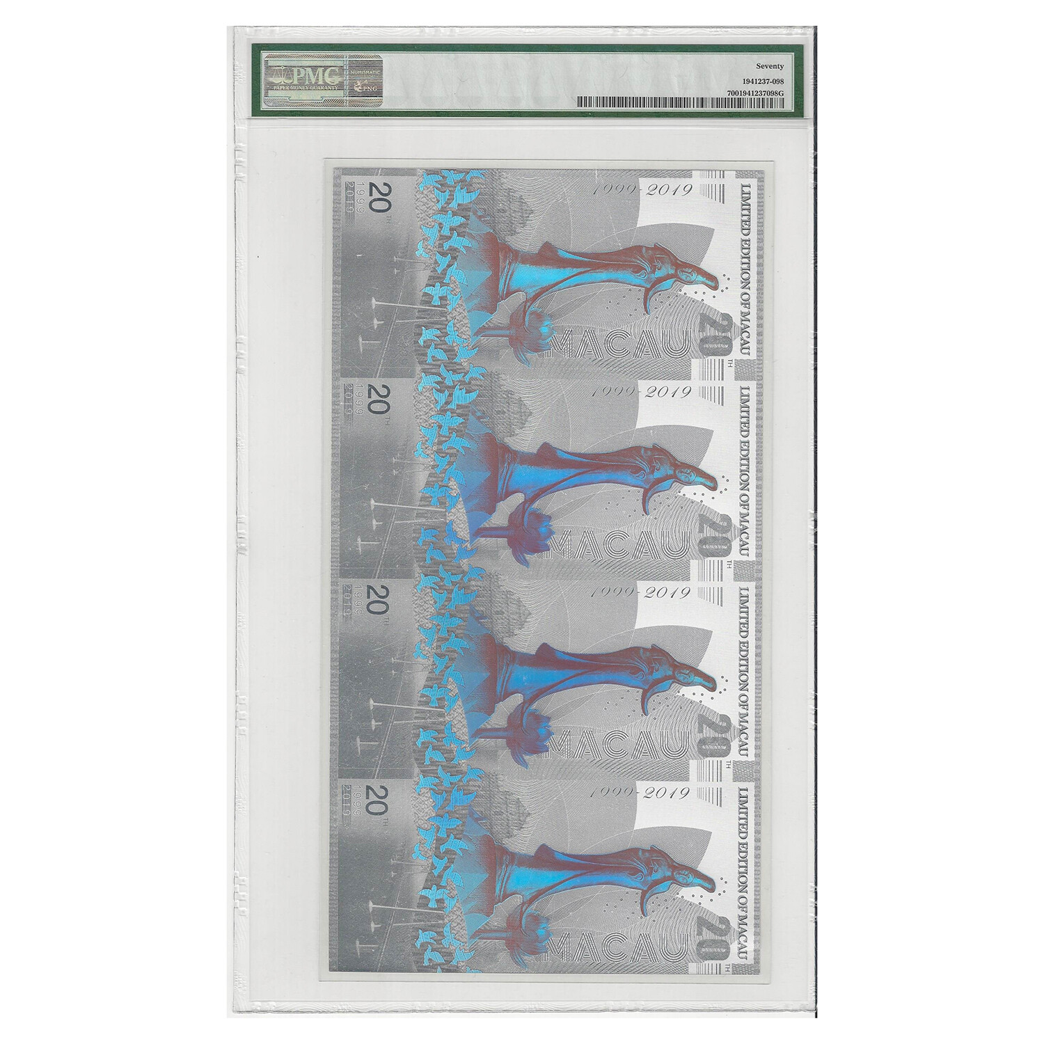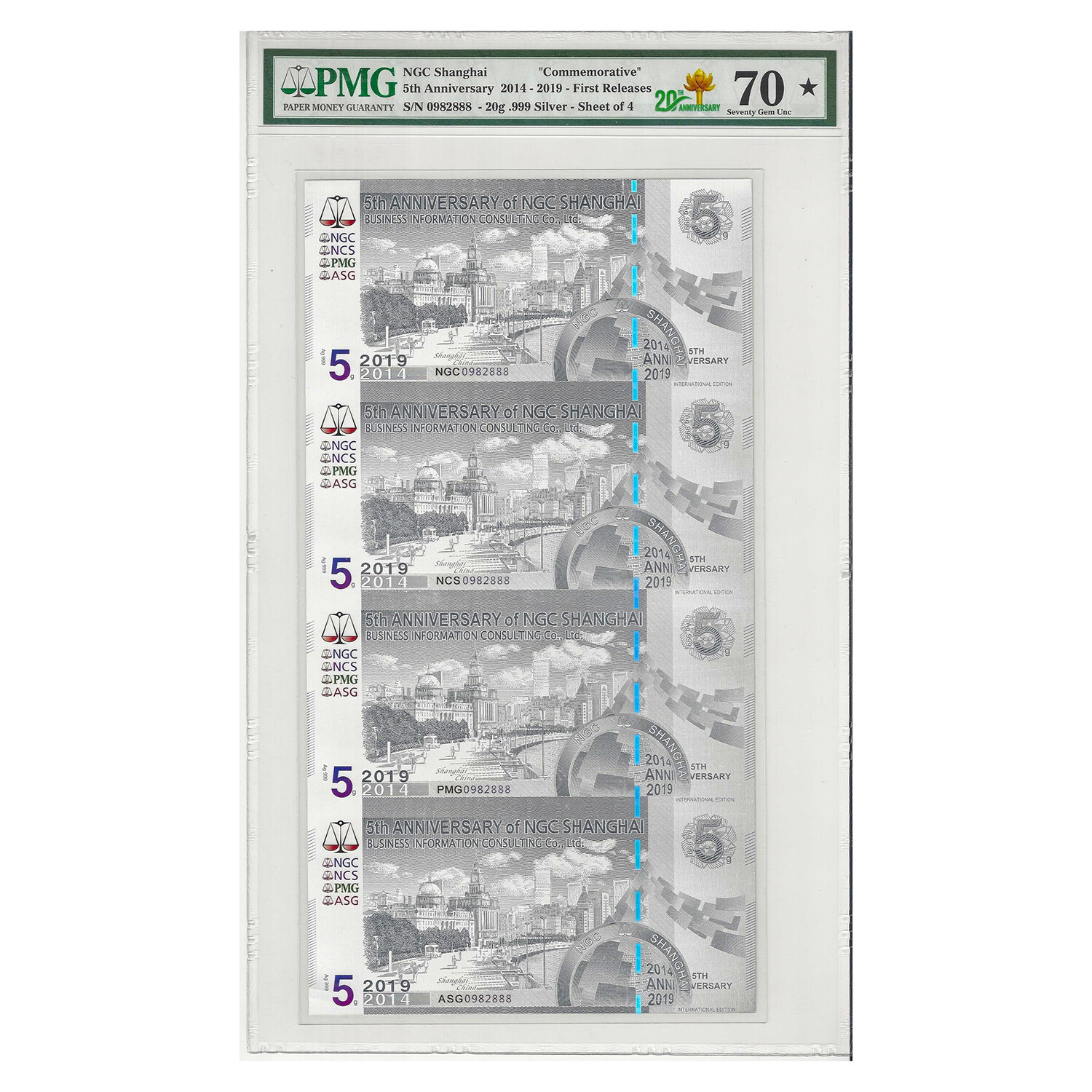 PMG 70 STAR 2014 - 2019 NGC COMMEMORATIVE FIRST RELEASES 20g Colored Silver Note - 5th Anniversary of NGC Shanghai (Limited Edition Macau Return 20th Anniversary Label). This is an uncut sheet of four notes.