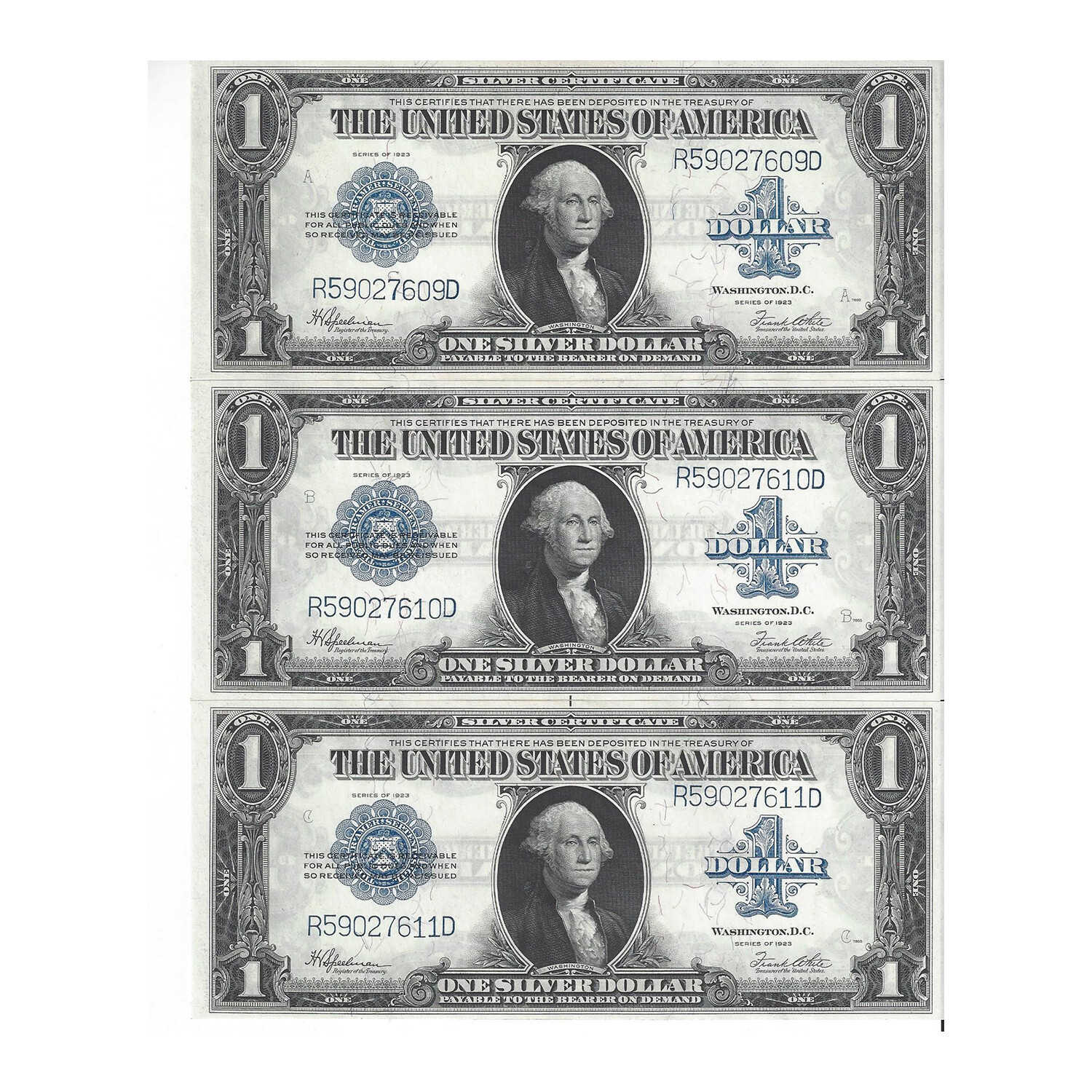 1923 $ 1 Silver Certificates 3 Consecutive # 609 - 611