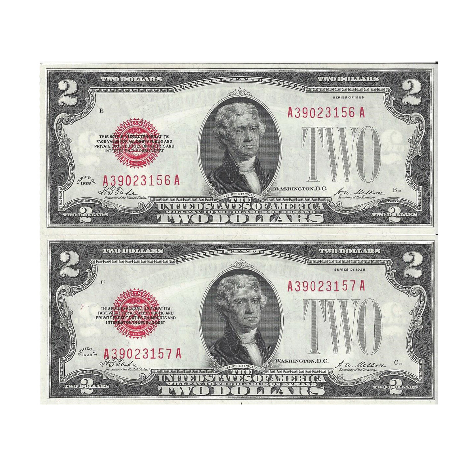 1928 $ 2 Legal Tenders 2 Consecutive # 156 - 157