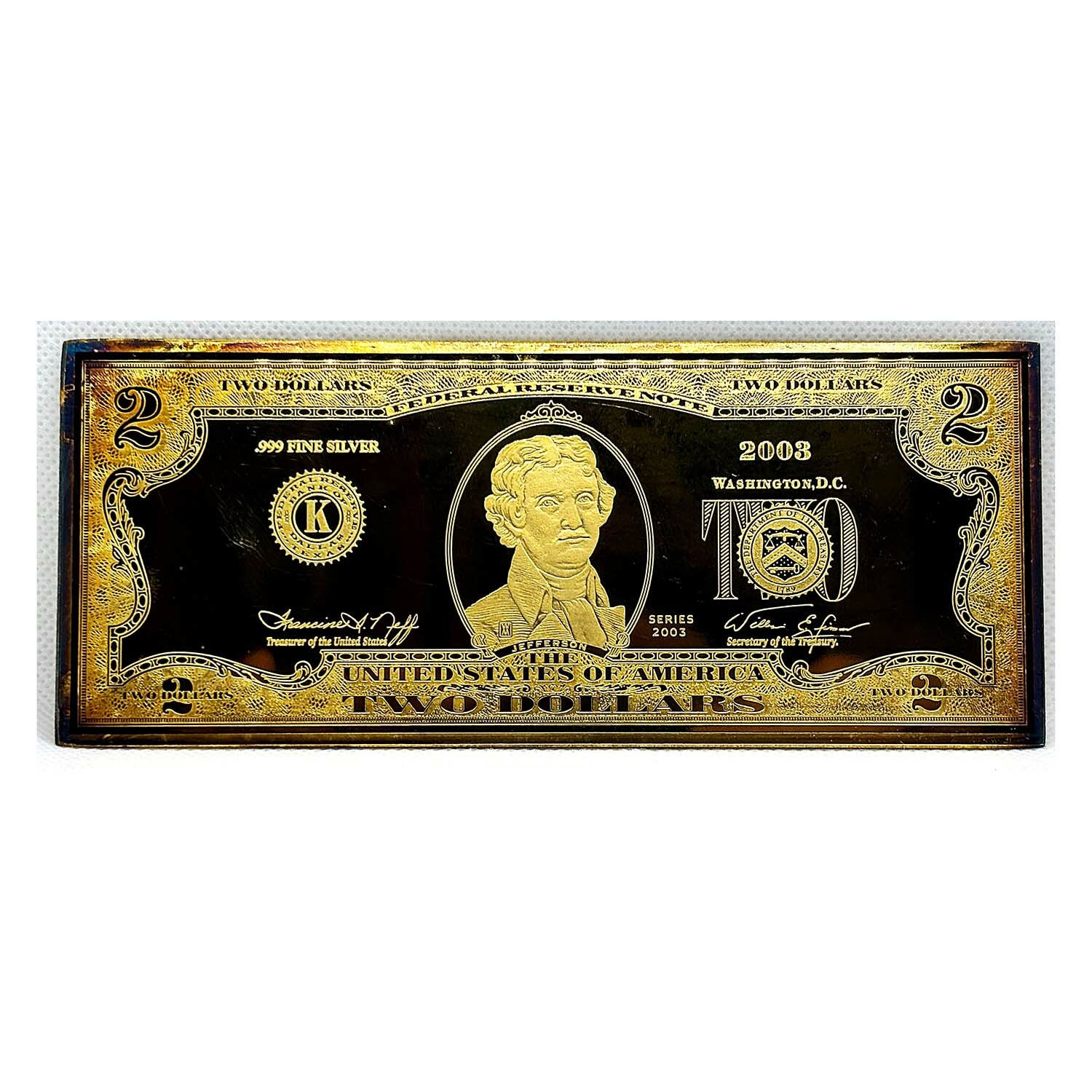 2003 $ 2 Federal Reserve 4 Ounce Silver Gold colored Bar