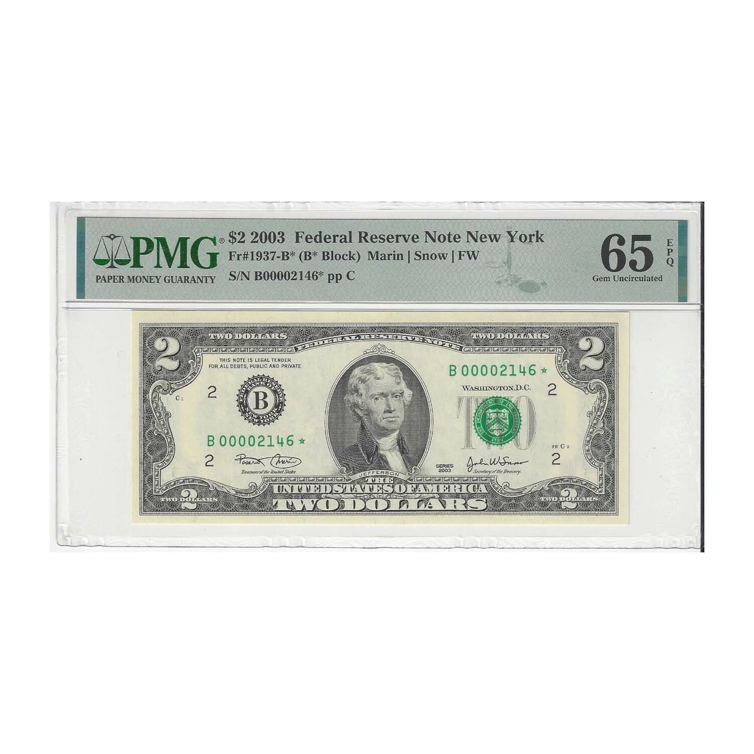 Being offered today is a RARE – Low Serial Number, STAR NOTE, AND High Grade example of a 2003 $ 2.00 Federal Reserve New York Note graded by