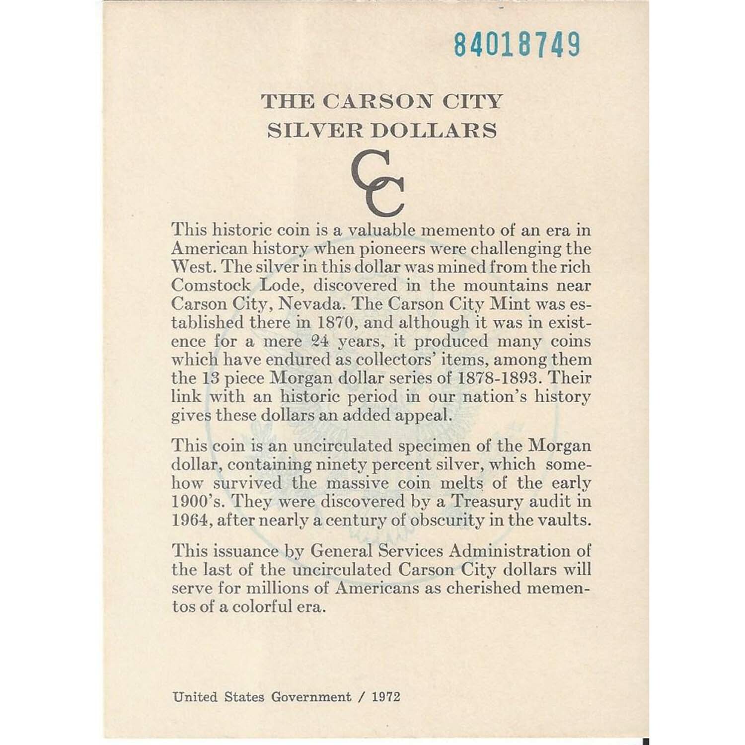 Carson City (CC) Morgan dollars in government holders are highly collectible. Original uncirculated coins were released by the General Services Administration (GSA) between 1972 and 1980 from the Treasury vault hoards.